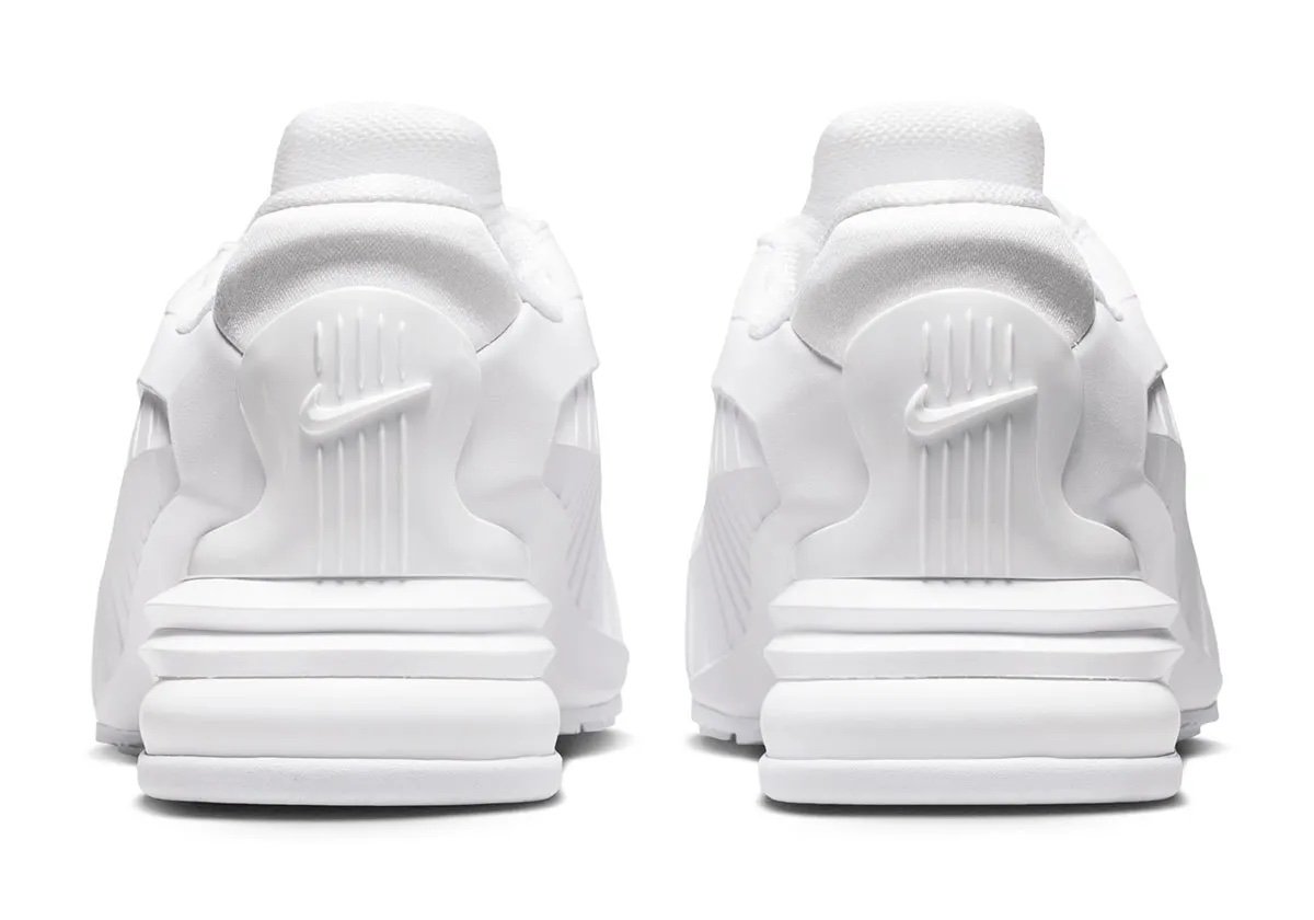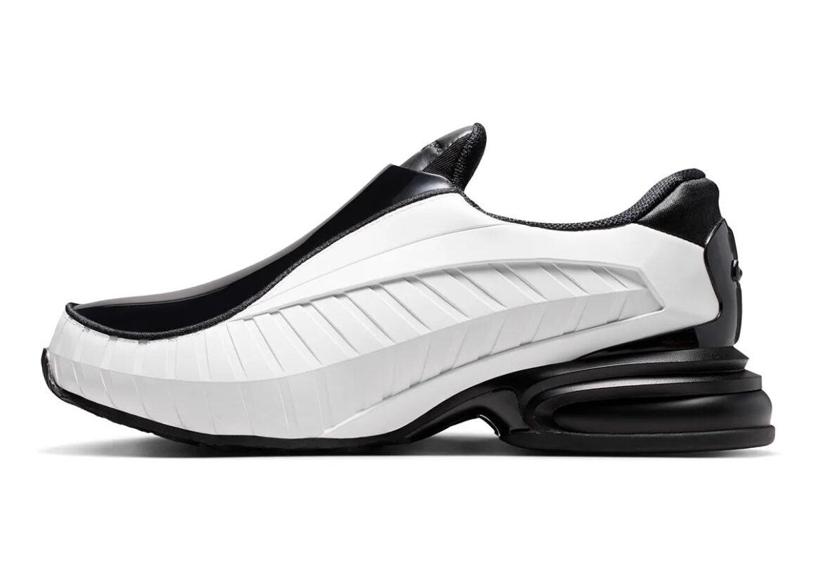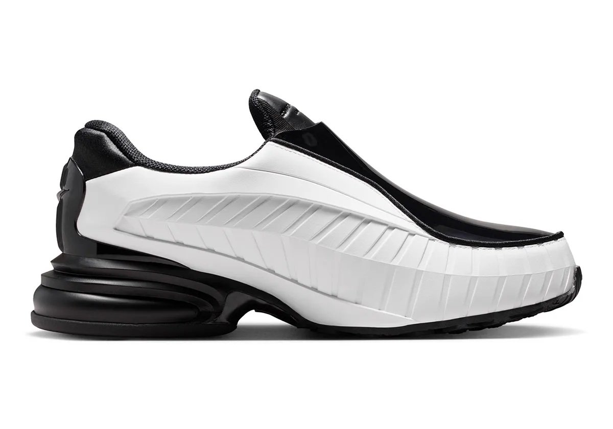 C’est lors de la Fashion Week de Paris 2025 que cette collaboration a été révélée pour la première fois. Fidèle à son approche conceptuelle, Comme des Garçons a intégré la paire dans un défilé où les volumes et les textures occupaient une place centrale. La sneaker s’est immédiatement distinguée par son allure minimaliste mais disruptive, attirant l’attention des observateurs les plus aguerris. Trois coloris ont été présentés, chacun explorant une facette différente du design. La Nike Air Max Dolce Triple Black, entièrement noire, joue sur une esthétique monochrome radicale. La tige noire, à l’aspect rigide, est parcourue par des nervures qui sculptent sa silhouette. La toebox façon mocassin est en cuir vernis assorti et contraste avec le cuir mat utilisé sur la languette. Cette dernière est estampillée d’une inscription Comme des Garçons Homme Plus, qui répond au mini Swoosh sur le talon. La paire repose sur une semelle noire, dont le quart arrière encapsule une unité d’Air opaque. La Nike Air Max Dolce Black White propose une approche plus contrastée, mêlant noir et blanc. Ici, la structure de la chaussure est davantage mise en avant : les découpes apparaissent plus nettes, les textures se répondent, et le branding reste volontairement minimal. Ce jeu de contrastes accentue le côté futuriste du modèle. Enfin, la Nike Air Max Dolce Triple White sublime la silhouette de 2002 à travers un monochrome blanc, mettant davantage en relief la construction futuriste de la paire.