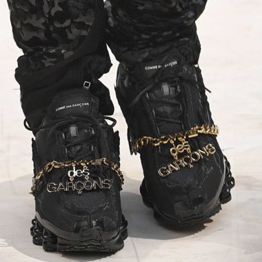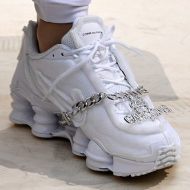 Ce sont deux paires monochromes qui ont ainsi été photographiées sur les podiums parisiens. L’une d’elle et complètement noire et la seconde blanche. Ces premiers visuels permettent de se faire une idée de ce que devrait être le rendu final. Chaque paire est équipée de la fameuse technologie Shox qui constitue l’intégralité de la semelle à la manière de la Total Shox lors de sa sortie originelle en 2003. Le duo inédit imaginé par CDG semble s’afficher dans une version légèrement déconstruite proposée ici dans une empeigne respirante en mesh. Le Swoosh latéral, ton sur ton, semble renforcé sur les deux itérations. Deux versions équipées de ce qui ressemble à une chaîne Comme des Garçons ont fait leur apparition comme le prouvent les clichés. Il est possible que cet accessoires n’accompagnent pas le version finale. Le nom des deux partenaires est également visible en lettrage noir sur fond blanc sur la languette de chaque paire.