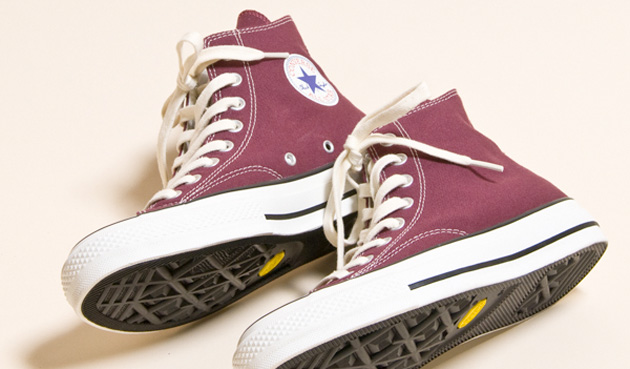 Converse continue de sortir de très belles paires de Chuck Taylor pour sa gamme Converse Addict. Destinée au Japon, la paire est déclinée dans une toile bordeaux semblable aux modèles originaux (la forme de la paire ainsi que ses coutures sont également très proches des modèles originaux en comparaison avec une Chuck Taylor basique). La semelle qui accompagne les Chuck Taylors de cette gamme sont fabriquées par Vibram.