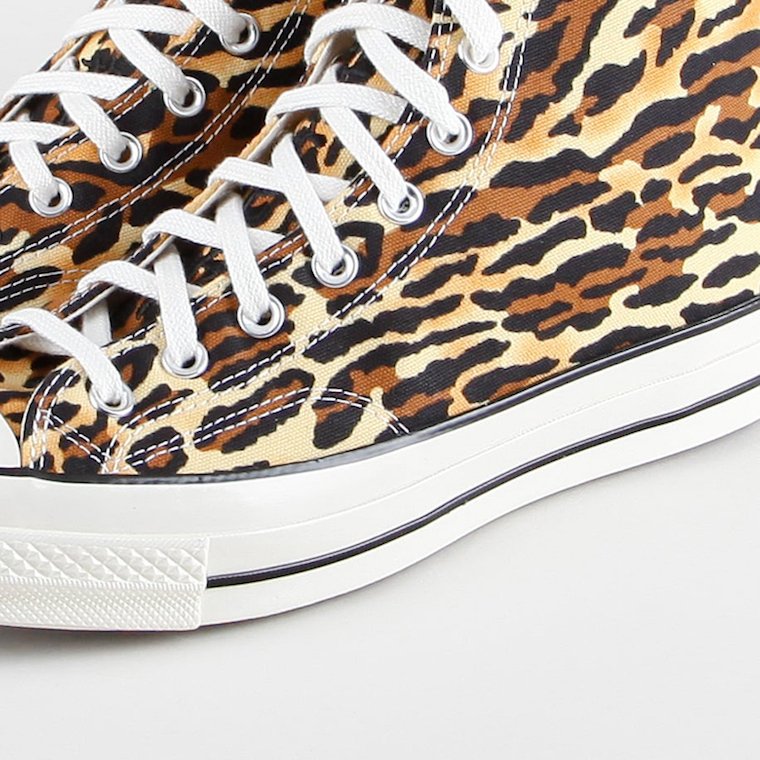 L’empeigne classique de la Converse Chuck 70 High est habillée d’une toile beige recouverte de motifs sauvages de félins. Nuancé de noir et d’ocre, le rendu est à la hauteur de l’attente puisqu’il modernise la légende de Converse sans la dénaturer. Le reste de la sneaker reprend le style des Chuck 70 avec une semelle vulcanisée blanche ornée du label de la marque au talon. La seconde paire du pack, une Chuck 70 Low, repose quant à elle sur une toile olive et c’est le léopard qui la relève pour un rendu très élégant. Les tâches noires et ocres du félin se marient parfaitement avec le vert de la toile. Pour signer cette triple collaboration, les noms de Wacko Maria et Invincible sont inscrits à l’intérieur de la languette.
