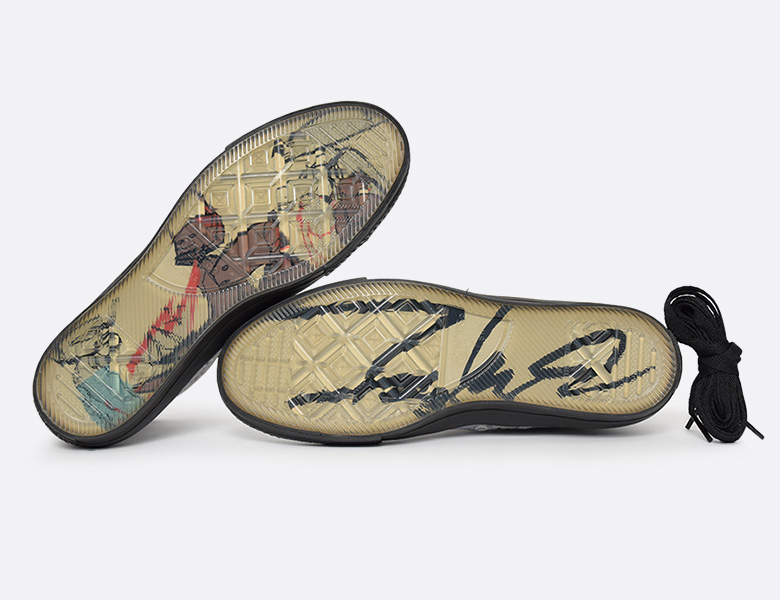 Ce sont les mêmes silhouettes qui ont été réimaginées par Futura mais avec un tout autre univers que le précédent. Les deux paires sont composées d’une toile réfléchissante (3M) recouverte par son motif « Skyfall » fait de projections de peintures réalisées à la bombe.