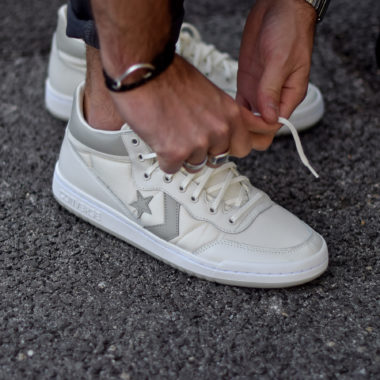 À l’époque, cette silhouette fut novatrice grâce à son mélange de matériaux comme le cuir, la mousse et le nylon qui lui ont garanti une des chaussures de basketball les plus légères. 34 ans plus tard, Converse relance ce modèle dans plusieurs coloris dont cette teinte dénommée « Parchment », un mix de blanc cassé et de gris. Son empeigne reste inchangée et on retrouve le logo à chevrons sur les côtés. Pour apporter un peu plus de confort, les équipes de Converse ont ajouté une semelle de propreté Nike Lunarlon.