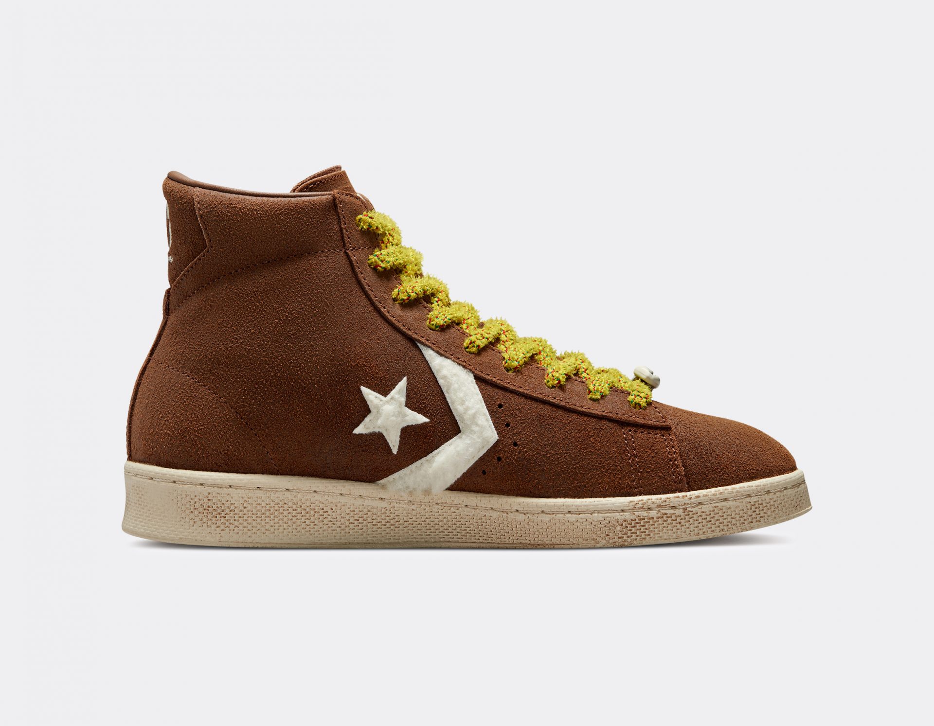 La collaboration entre Converse et Barriers Worldwide se poursuit avec une Pro Leather High. La silhouette montante se pare de cuir suédé acajou et porte un logo latéral étoile blanc en sherpa. Le côté intérieur est également gaufré du nom de Barriers, qui s’accorde au logo Converse sur le heeltab. La semelle subit un traitement vintage, qui se marie au côté pelucheux des lacets, pour un côté vieilli du plus bel effet. Ces derniers sont ornés de deubrés en formes de cauris, utilisés comme talismans par les esclaves afro-américains.