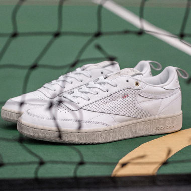 Pour cette fin d’année 2016, c’est avec Reebok qu’ils se sont associés. Le choix du modèle s’est porté sur la Reebok Club C. La paire réalisée est très sobre et colle bien à son univers d’origine, le tennis. On retrouve d’ailleurs un cuir tissé sur l’intérieur du pied pour rappeler les filets de tennis. Le reste de la paire est en cuir blanc et une semelle vieillie accompagne le tout. On retrouve également une tirette au niveau du talon pour enfiler les sneakers. Enfin, sur l’arrière de la languette, on peut lire l’inscription « Be Reasonable, Demand the Impossible ».