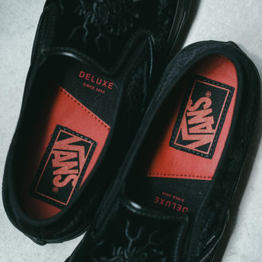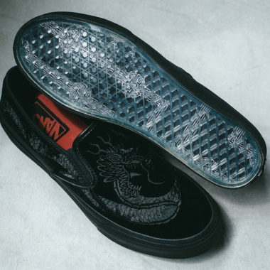 La construction classique de cette Slip-On ne délaisse pas pour autant la qualité qui est ici au rendez-vous. La sneaker arbore une empeigne noire en suede premium sur laquelle est disposé un motif de dragon cousu en symétrie sur chaque pied. Le corps du dragon matérialisé par un suede gris serpente sur le côté jusqu’au talon. Ici, Deluxe et Vans font un clin d’œil évident aux nombreuses représentations des dragons sur les souvenir jackets. Une semelle gaufrée inhabituelle équipe cette nouveauté 2018 et fait écho à la réputation de ces créatures mythiques, souvent représentées comme des personnages divins entourés de cascades et d’eau. Pour matérialiser cette croyance populaire, la semelle est transparente et dévoile un autre élément graphique typique de la culture nippone. Seules les deux semelles de confort trahissent une touche de couleur, en l’occurrence un rouge vif. Combiné au noir profond de la sneaker, Vans a souhaité offrir un look feutré à cette sneaker. Le nom des deux entités collaboratrices apparaît sur ces semelles tandis que le nom de la marque américaine est rappelé comme à l’accoutumée sur l’étiquette latérale très discrète ainsi que sur le badge appliqué au talon.