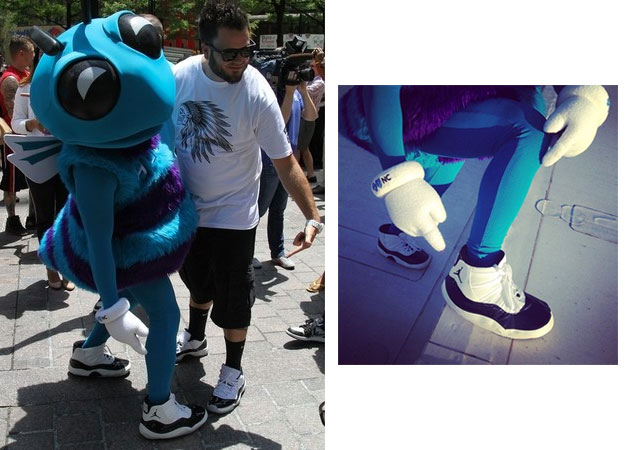 Une petite info qui nous a fait sourire en découvrant les images ce matin et qui devrait plaire aux amateurs de la NBA version 1990’s. Vous n’êtes pas sans savoir que l’équipe NBA de Charlotte a récupéré son nom et redevient les Hornets. La mascotte, Hugo, est donc de retour. Le club lui a confectionné une paire sur-mesure de Air Jordan XI concord. On imagine bien qu’avec le propriétaire de la Franchise de Caroline du Nord, Michael Jordan, on devrait avoir quelques surprises de chez Jordan Brand dans les saisons à venir. Les Charlotte Hornets étaient d’ailleurs un très bel outil marketing pour la NBA dans les années 1990 avec son trio Mourning/Johnson/Bogues.