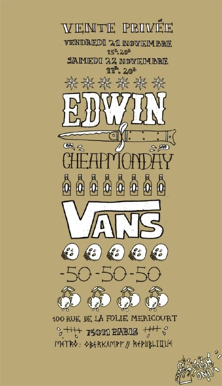 Par Sneakers.fr Wear 21 novembre 2008Edwin, Vans – Vente privéeUn bon plan pour aujourd’hui et ce week-end avec cette vente privée organisée sur Paris à République : Edwin, Vans, Cheap Monday… Cela débute à partir de 15h ce vendredi, au 100 rue de la folie méricourt, 75011 Paris.