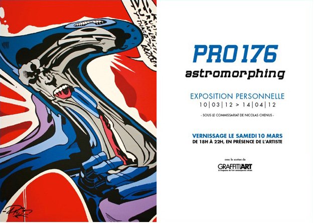 Après le succès de l’expo solo de Smash 137, la galerie Celal attire notre attention sur un artiste français émergent : Pro176. Bercé par les comics, influencé par le cubisme et le futurisme, et par le graffiti qu’il a commencé à pratiquer à la fin des années 80, Pro176 transpose ainsi depuis vingt ans son univers imaginaire astro-galactique sur toile. Astromorphing, première expo solo de l’artiste à Paris, présente ses derniers dessins et peintures sur papier, tout en distorsion, avec une grande nouveauté : la mosaïque.