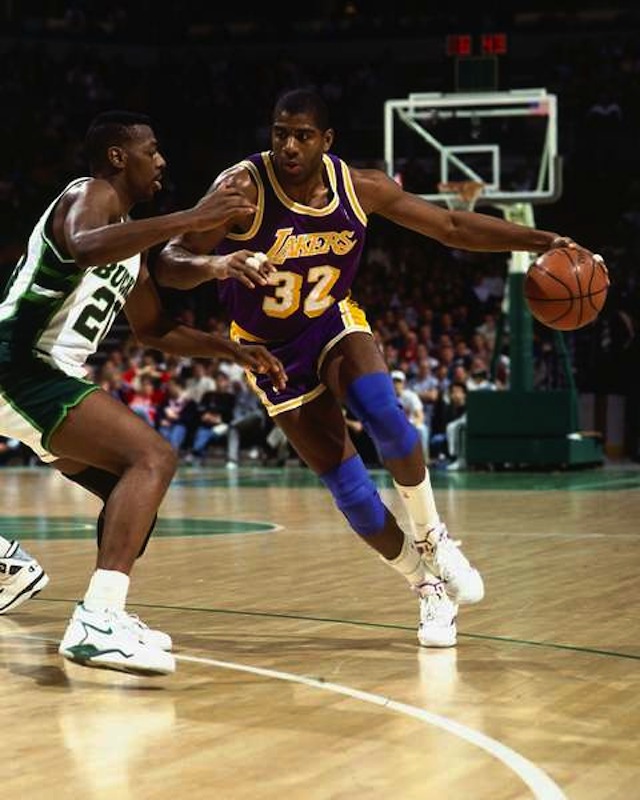 Est-il le plus grand joueur de tous les temps ? Lui même ne se pose pas la question et pense être le meilleur de sa génération et même plus encore. Earvin « Magic » Johnson est un ancien joueur de NBA qui a rejoint la ligue à l’âge de 20 ans après avoir été drafté en 1979 par la franchise des Lakers de Los Angeles. Magic Johnson a évolué au poste de meneur durant 13 saisons pour le club des Lakers bien qu’il soit capable de jouer également à d’autres postes. Il est, aujourd’hui, considéré comme l’un des meilleurs meneurs de l’histoire du basket-ball et de la NBA, cela se confirme par des statistiques remarquables : 19,5 points et 11,2 passes de moyenne par match (classé parmi les 50 meilleurs joueurs de la NBA). À noter que ce meneur hors norme a remporté cinq fois le championnat NBA avec l’équipe de Los Angeles et a été élu trois fois MVP de la saison régulière. Magic Johnson a eu, durant sa carrière, trois modèles signature de la marque Converse (Converse Weapon ’86, Converse MX Thrillin et Converse Magic) ainsi qu’une paire de Magic 32 qu’il a lui-même produite par le biais de son entreprise Magic 32.