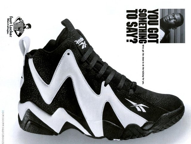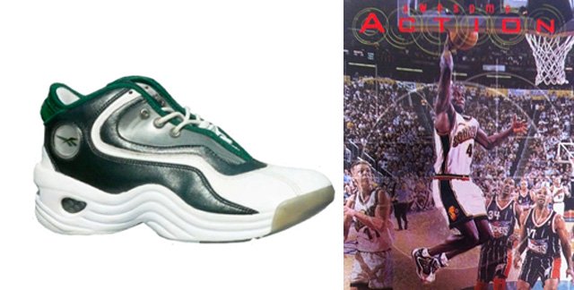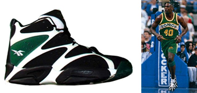 Durant l’été 1994, Shawn Kemp est convoqué pour défendre les couleurs des États-Unis au championnat du monde, compétition où il gagnera la médaille d’or avec une ligne de statistiques impressionnantes puisqu’il cumule 9,4 points, 6,8 rebonds et 1,1 contre en 15,9 minutes. Reebok souhaite récompenser cet ailier fort hors du commun en lui concevant un modèle signature qui respecte le code couleur de la franchise dans laquelle il évolue. La publicité de l’époque est un petit trésor :