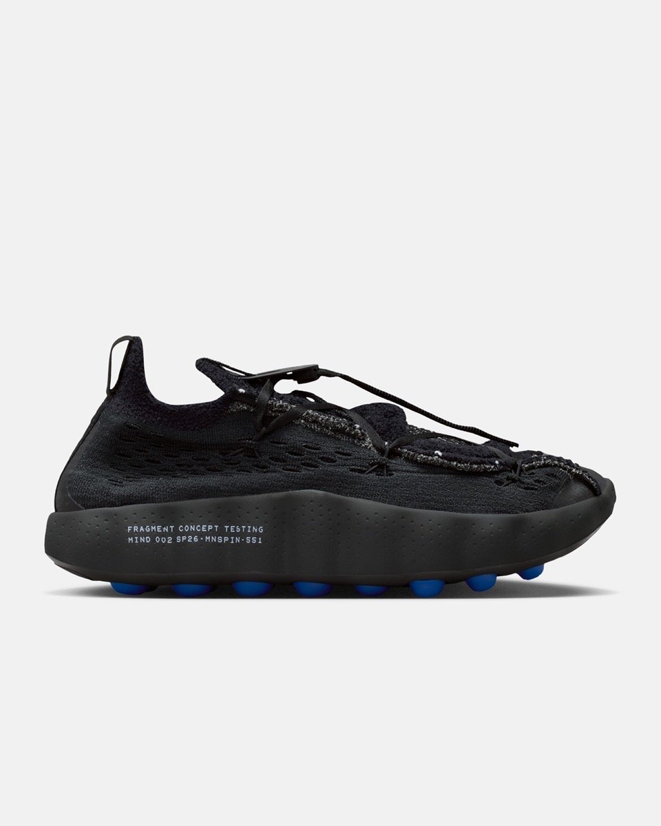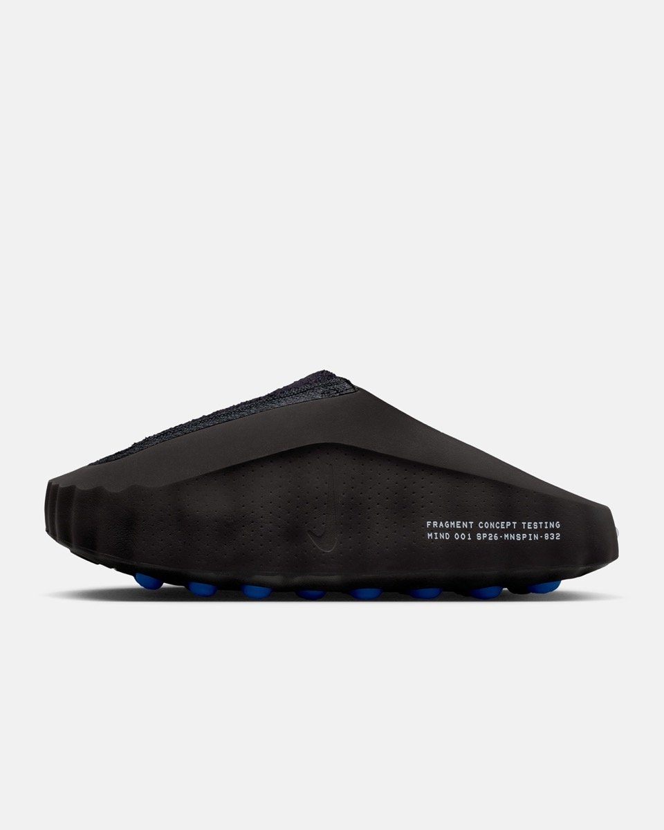 Parmi les pièces les plus attendues de la collection, la Fragment x Nike Mind 002 se distingue par une construction entièrement retravaillée. La tige abandonne les matériaux classiques pour adopter une base en Flyknit, plus souple et plus respirante, avec des textures épaisses et parfois légèrement duveteuses sur l’avant-pied. Le système de laçage a également été modifié. Les lacets passent à travers des câbles intégrés dans la structure, rappelant les technologies Flywire. La semelle conserve les fameux plots caractéristiques de la gamme Mind, colorés dans le bleu signature de Fragment. Ces éléments visibles renforcent l’aspect expérimental de la paire et rappellent que cette collection se situe entre design industriel et performance scientifique. On retrouve également les marquages typiques de Fragment, comme les inscriptions type industriel sur la semelle intermédiaire. La Fragment Design x Nike Mind 002 se décline dans deux coloris : l’un totalement noir, et l’autre gris, affirmant le côté minimaliste du label japonais. La Fragment Design x Nike Mind 001 reprend la silhouette mule du modèle populaire du Swoosh. Elle se pare ici de TPU noir, complété par du tissu éponge sur la toebox. La paire repose sur une semelle aux plots bleus.