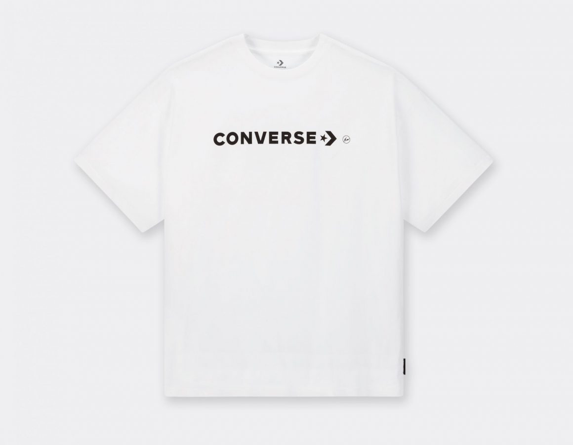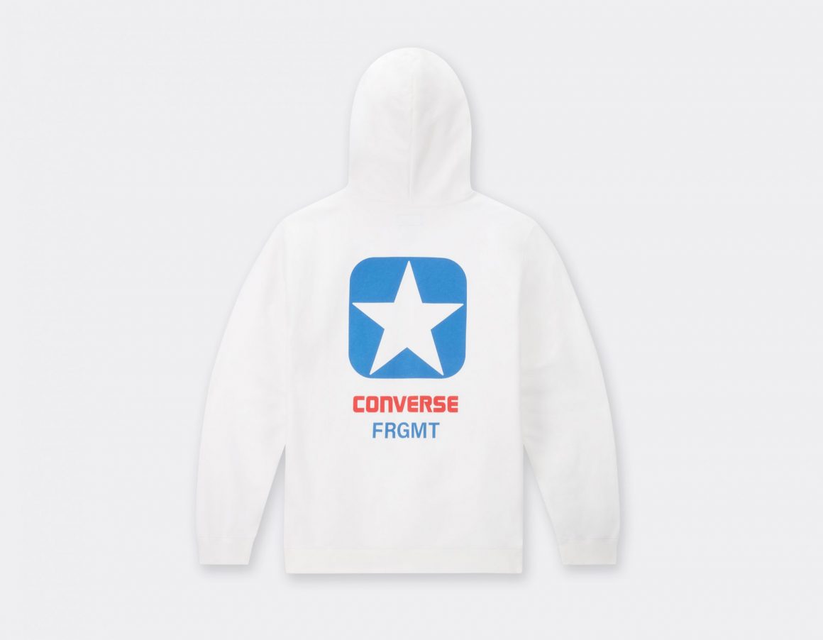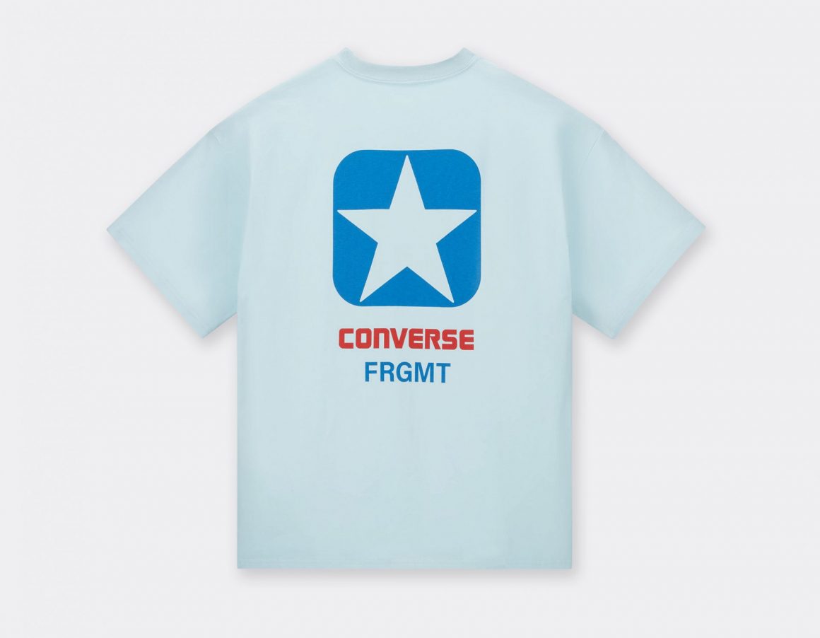 Pour compléter cette collection textile, un hoodie blanc porte la mention FRGMT en bleu, ainsi qu’une étoile à l’avant. Son dos arbore une étoile, surmontant le nom de Converse en rouge et celui de Fragment en bleu. Un tee shirt blanc est floqué d’une inscription Converse noire, à côté de laquelle se trouve un discret logo éclair fragment. Enfin, un dernier tee shirt reprend une construction similaire à celle du hoodie, et se pare de bleu ciel.
