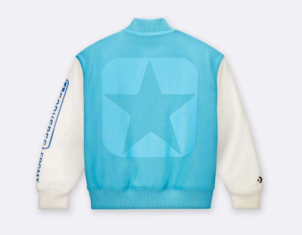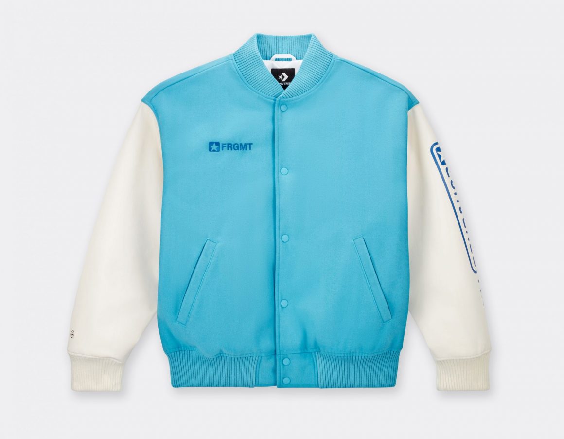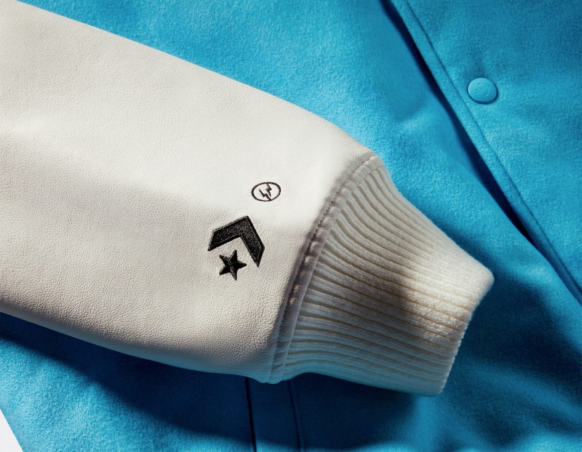 Pour accompagner cette Converse Weapon x fragment, une collection textile a été imaginée par le label japonais. La veste Teddy est en laine turquoise, brodée à l’avant d’un logo étoile, accompagné de la mention FRGMT. Les manches blanches sont en cuir synthétique et l’une d’elle est floquée des logos bleus des deux marques sur la longueur. L’autre porte une broderie noire au niveau du poignet, reprenant les logos des deux marques. Le dos est floqué d’une imposante étoile ton sur ton.