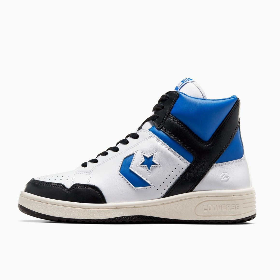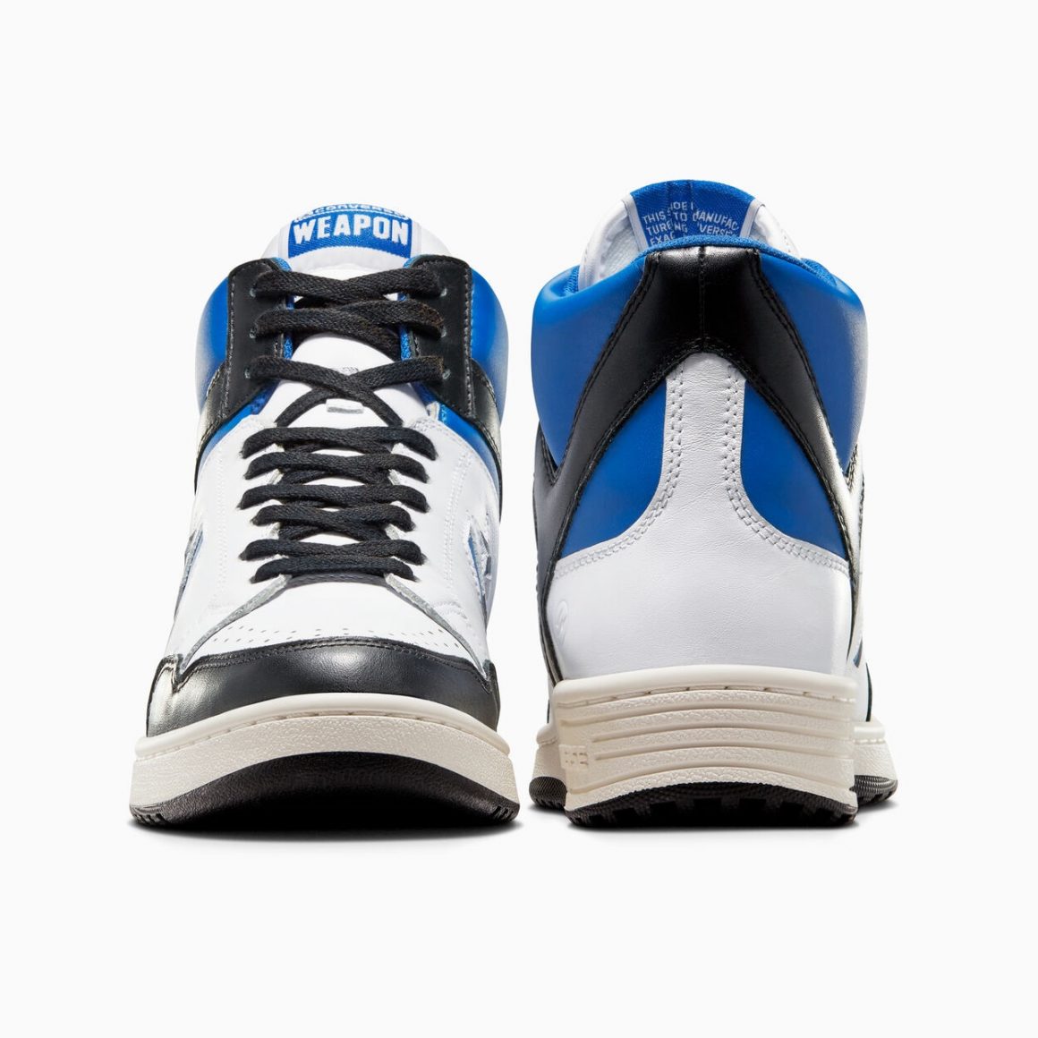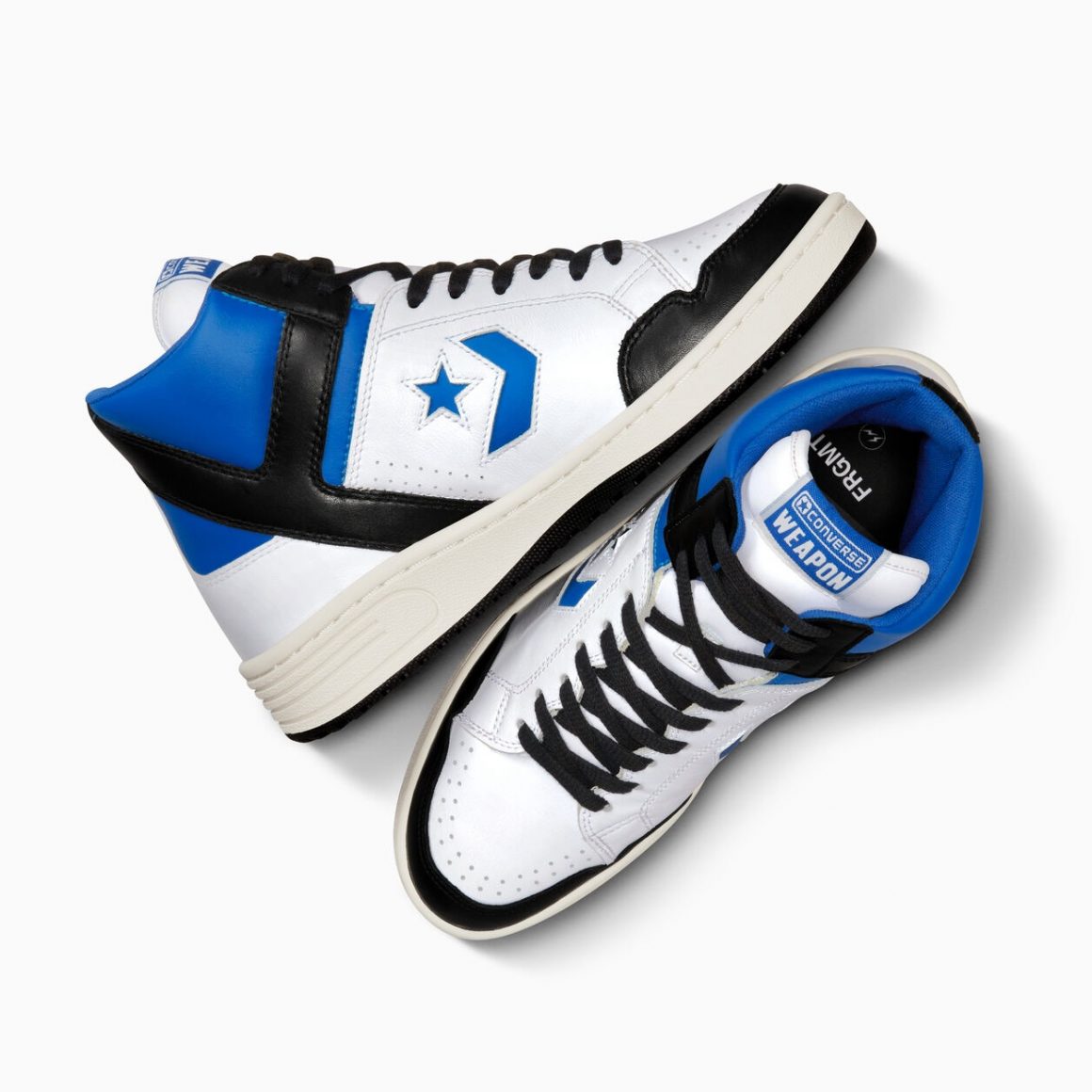 fragment et Converse n’en sont pas à leur coup d’essai, mais pour cette capsule fragment x Converse Weapon Collection, les deux entités travaillent pour la première fois sur un tel modèle de la marque américaine. La Converse Weapon x fragment présente une silhouette montante en cuir lisse. Il est blanc sur la toebox et les panneaux latéraux. Le garde-boue avant noir se marie au renfort arrière en forme de Y, ainsi qu’aux lacets plats. Pour signer cette collaboration, fragment utilise son bleu distinctif sur le col de cheville, et sur les logos latéraux. Le colorblock appliqué sur cette sneaker n’est pas sans rappeler les paires de Air Jordan 1 fragment imaginées par le designer. Un mini logo fragment est gaufré que le quart arrière intérieur de la paire et surmonte la semelle intermédiaire blanc cassé. Celle-ci repose sur une semelle extérieure noire. Cette composition chromatique n’est pas sans rappeler les designs les plus iconiques du label nippon.