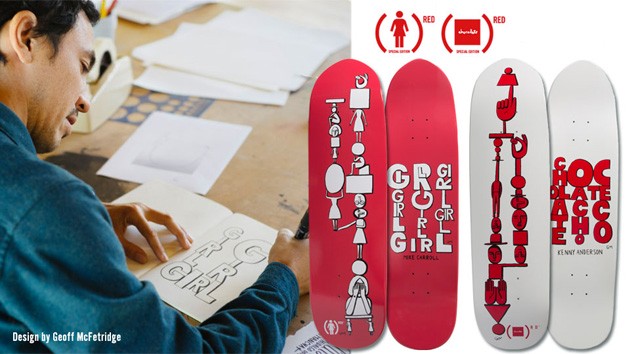 Chaque année, les marques de chez Crailtap (Girl et Chocolate skateboards) réalisent divers produits pour l’initiative product (Red). Voici les tee-shirts et planches (designées par Geoff McFetridge) que ces deux marques proposent cette année.