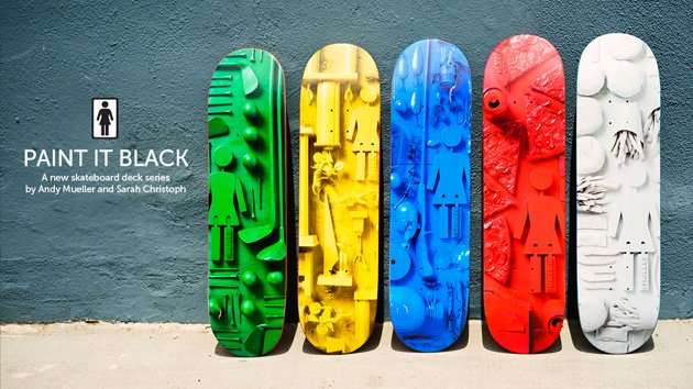 Girl Skateboards propose une nouvelle série de planches dont l’inspiration vient du titre des Rolling Stones ‘Paint it black’. Ces boards monochromes ont été réalisées par Andy Mueller (The Quiet Life) et Sarah Christoph (Crailtap) et représentent l’univers de plusieurs riders du team Girl.