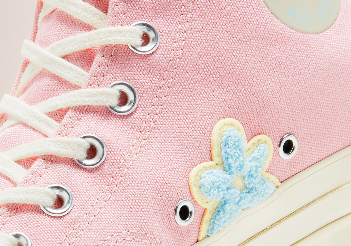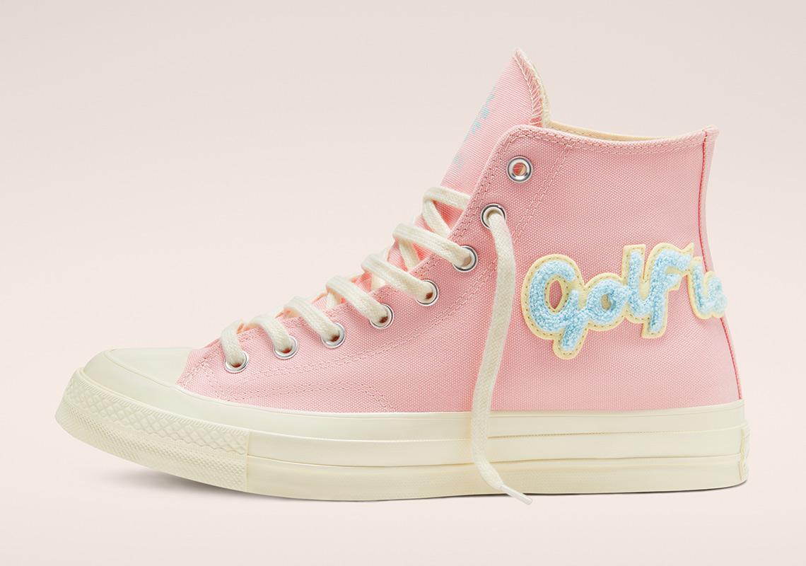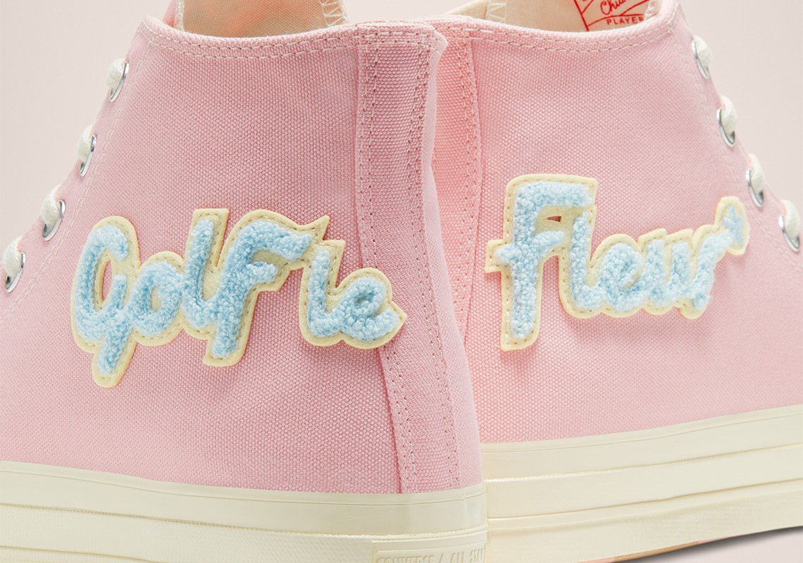 La paire classique est à nouveau au cœur du projet. Elle est réinterprétée dans un code couleur rose bonbon qui tranche franchement avec les autres sorties du moment dans des tons sobres et discrets. La sneaker est agrémentée d’un branding Golf le Fleur dans un revêtement de type chenille et dans une palette bleue et jaune pastels qui épouse le talon. Le logo signature du membre d’Odd Future, une fleur, est dupliqué sur le haut de la languette dans un code couleur similaire. Il est dévoilé dans un lettrage noir sur les semelles de confort. La tige haute est en toile, le matériau de base de cette sneaker mythique. La paire repose sur une midsole blanc cassé complétée d’une semelle extérieure en gomme et gaufrée. Le jeu de lacets fait directement écho à la semelle intermédiaire pour conserver une unité.