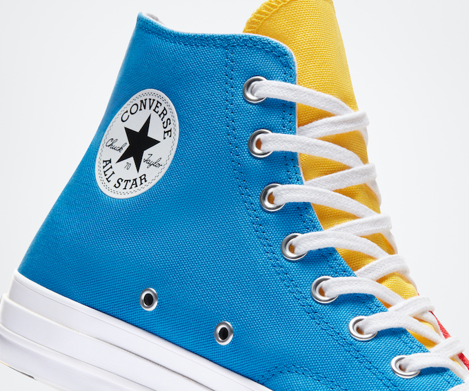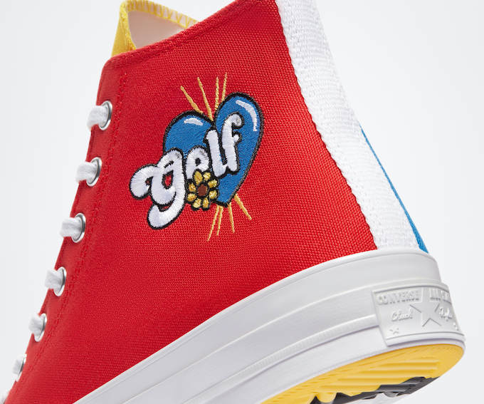 Une robe multicolore habille la sneaker : l’empeigne est présentée dans des teintes jaune, rouge, blanche et bleue. Ces couleurs sont disposées sur différents empiècements de cette empeigne en toile pour créer une palette chromatique détonante. Converse inaugure également un nouveau logo Golf Le Fleur sur ce modèle. Disposé sur l’intérieur de la sneaker et sur la partie haute de la boîte, il présente un cœur bleu entouré du branding Golf du nom de la collection, disposé sur l’extérieur du pied ainsi que sur les semelles de confort. Petite particularité, il est directement brodé sur le matériau pour un rendu qualitatif et durable dans le temps. Le logo Converse étoilé est également présent sur l’intérieur de la sneaker. Une semelle blanche en caoutchouc complète le look et fait écho au jeu de lacets de même couleur. La semelle extérieure affiche, elle, une robe tricolore pour aller encore plus loin dans l’originalité de la création.