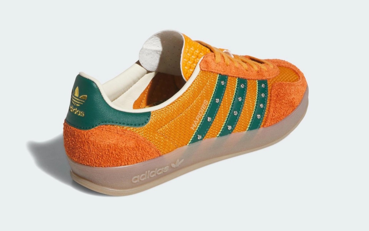 L’empeigne de la Hardies x adidas Gazelle Indoor se distingue par un mesh premium d’une grande qualité, qui couvre la majeure partie de la tige avec une finition douce et légèrement veloutée au toucher. Il est renforcé par du cuir suédé sur les garde-boues et les passages de lacets. Cette matière confère à la paire une allure raffinée, tout en rappelant les racines skate et street de Hardies, où la robustesse du matériau est aussi importante que son esthétique. La palette de couleurs explore une combinaison audacieuse entre orange et vert forêt intense, créant un contraste chaud et terreux qui capte immédiatement l’œil sans jamais tomber dans l’excès. Le branding adidas classique est présent sur les côtés sous forme de trois bandes perforées, permettant à la fois respirabilité et discrétion visuelle. Il est relevé par des incrustations de strass, ajoutant de l’originalité à la paire. Hardies signe sa présence en apposant son nom doré au-dessus des bandes latérales. La paire repose sur une semelle en gomme naturelle, équilibrant ainsi la construction chromatique de cette collaboration.