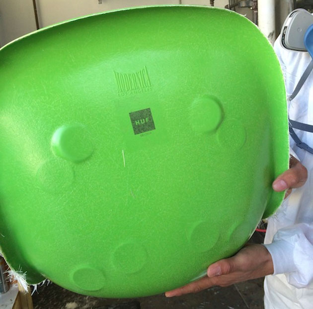 DSR, DSX, DSW… les chaises en fibre de verre imaginées par les époux Eames se retrouvent dans tous les magazines de décoration et les boutiques depuis quelques années désormais. L’objet est presque devenu incontournable et très peu d’entreprises savent les fabriquer comme les originales, c’est à dire en fibre de verre. Les Californiens de Modernica continuent de respecter l’idée originelle des Eames en confectionnant les chaises dans leur matériau d’origine. Une autre équipe californienne, celle de HUF, a fait confectionner une chaise à leur couleur pour ce printemps. Vous pourrez la voir sous plusieurs angles dans la suite de cette news.