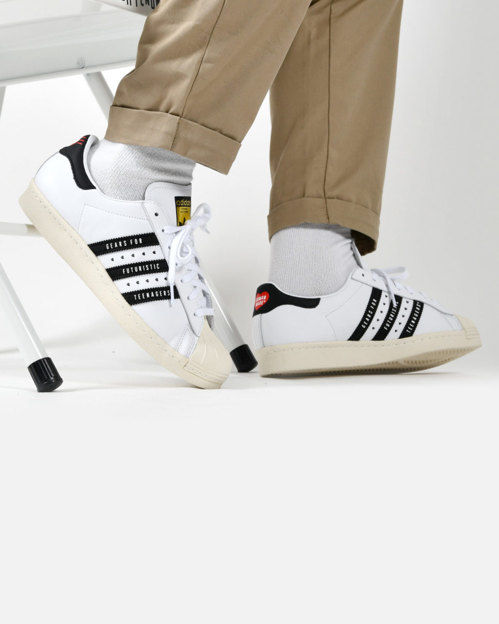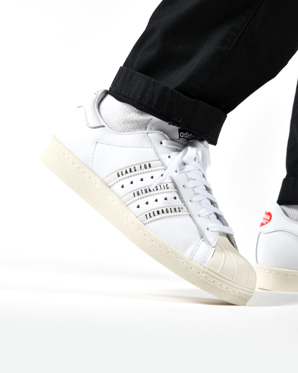 Trois coloris White/Black, Black/White et White/White très retro ont été conçus pour ce partenariat. La plateforme du projet, l’adidas Superstar 80’s, est une version de la sneaker classique au look vintage. Ce rendu volontaire prend notamment la forme d’un traitement légèrement jauni sur les semelles. Chaque modèle adopte plusieurs éléments inédits qui rappellent la collaboration comme l’inscription « Gears For Futuristic Teenagers », le slogan de la marque de Nigo, flanquée sur les bandes latérales. On retrouve également le logo Human Made apposé au talon, sous la forme d’un cœur rouge. Une paire se démarque du lot : le modèle blanc et noir. Autre originalité apportée sur le modèle, les aérations latérales prendront la forme de petit cœur, pour renforcer la référence au logo de Human Made. L’identité de la Shelltoe d’origine reste intacte avec sa construction à tige basse en cuir et ses codes couleur proposés à son lancement.
