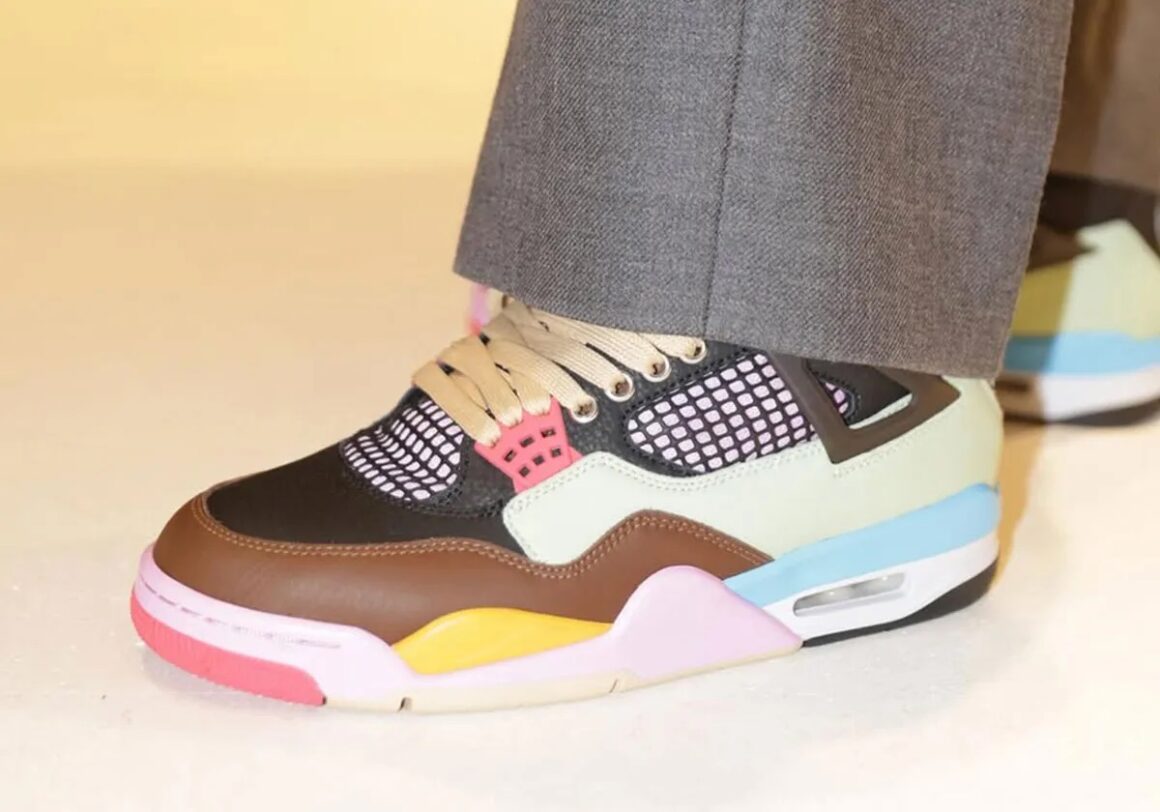 Cette J Balvin x Air Jordan 4 conserve les contours qui font sa légende : la tige haute sculptée, la cage latérale, l’arrière prononcé, la semelle moulée avec amorti Air visible et la silhouette équilibrée qui a traversé les décennies. Mais tout change dès qu’on regarde la palette et les traitements. La version J Balvin multiplie les couleurs sur un cuir lisse. La toebox noire se marie avec les passages de lacets et au talon. Ces derniers portent un logo Nike Air et un logo J Balvin argentés. Le reste n’est qu’exploration de couleurs vives. Les lacets beiges traversent des œillets en TPU rose vif, le garde-boue avant se pare de marron et contraste avec le vert amande du garde-boue arrière. La semelle intermédiaire est rose pâle à l’avant, blanche à l’arrière et liserée de bleu ciel. La semelle extérieure mêle noir, beige et rose vif.