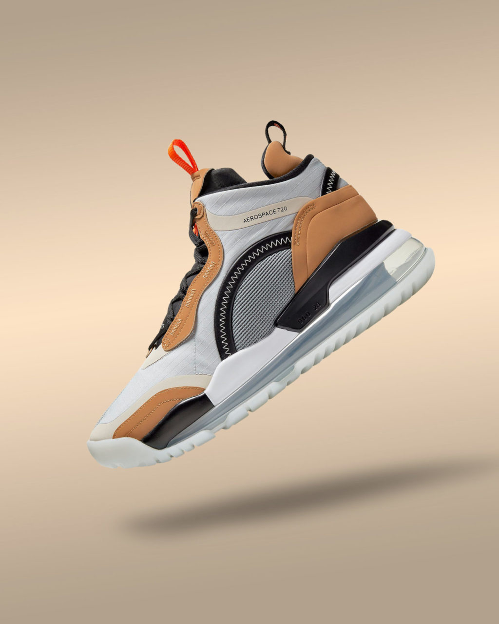 La silhouette imposante et futuriste de la Jordan Aerospace 720 est construite à base d’un tissu ripstop blanc cassé, lui assurant une durabilité certaine. Des empiècements en nubuck doux camel sont cousus autour des passants de lacets, aux bords de la toebox, sur le sommet de la languette et au niveau de la tirette au talon. Deux empiècements circulaires en cuir noir ornent les côtés de la paire. Les coutures apparentes de toutes ces pièces participent au côté futuriste de la sneaker. Et pour ajouter à cela, des inscriptions blanches sont imprimées à la base de la languette en nylon noir. Afin de relever la palette chromatique classique de la sneaker, une tirette orange vif agrémente la languette et s’accorde à la semelle intérieure. La Jordan Aerospace 720 Grey Fog repose sur une semelle bénéficiant de l’amorti d’air le plus imposant de Nike. L’unité d’air est protégée par une semelle intermédiaire blanche et noire au dessus et est complétée par une semelle extérieure quasi- translucide sur laquelle un Jumpman noir rappelle celui cousu sur la languette.