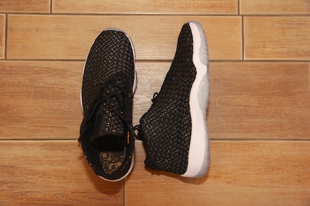 Alors que nous découvrions la Jordan Future ‘Jordan Brand Classic’ la semaine dernière au Barclays Center de New York, de nouvelles photos viennent d’apparaitre. La paire, tressée avec du fil doré et avec sa semelle pailletée, n’est toujours pas prévue pour une sortie grand public. Le modèle n’est pour l’instant distribué qu’à certains joueurs pros.