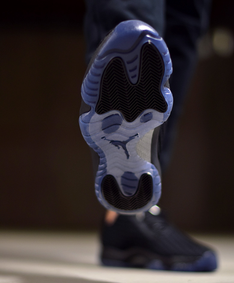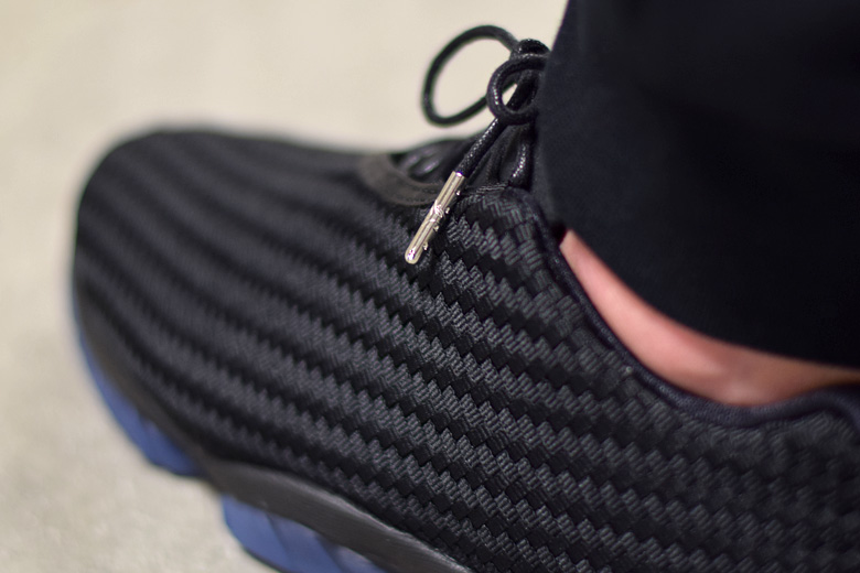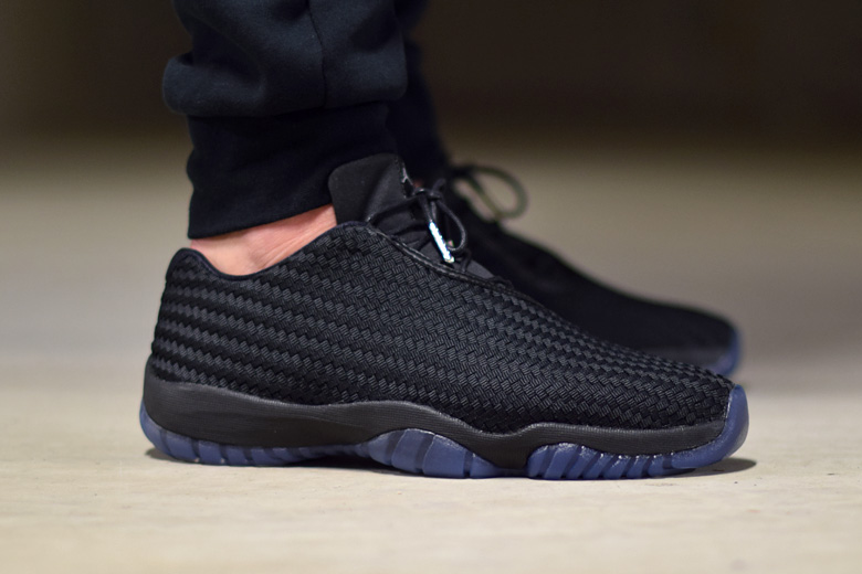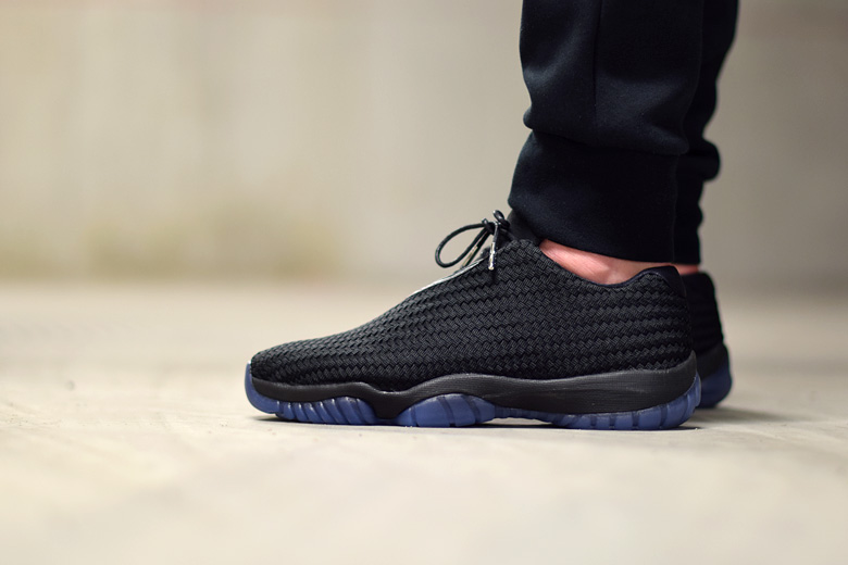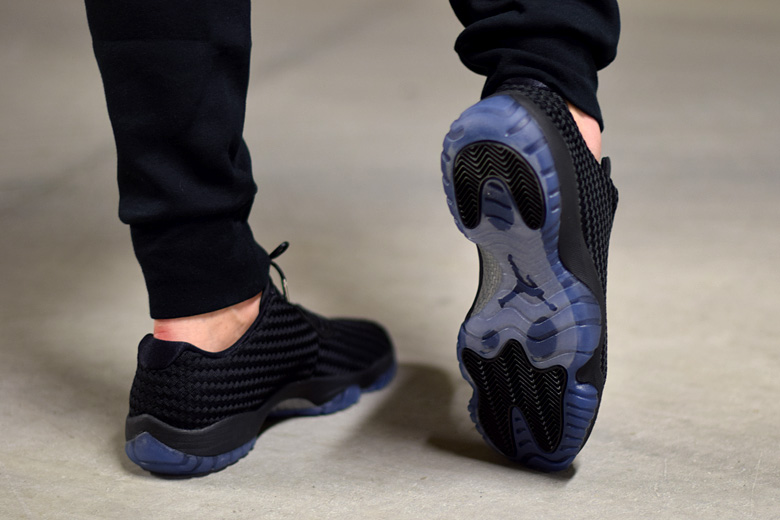 Le combo concocté sur cette Future Low rappellera tout de suite aux amateurs la fameuse Air Jordan XI Gamma Blue sortie il y a quelques années. Le modèle est intégralement noir et ses lacets ronds sont cirés. La semelle extérieure est icy avec une teinte bleue.