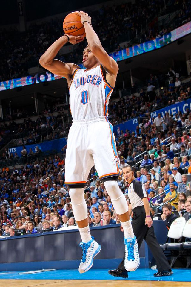 Nous vous avions récemment annoncé la signature de Russell Westbrook chez Jordan Brand. Lors de la rencontre opposant les Thunder d’Oklahoma City aux Charlotte Bobcats, Mr explosive portait une paire de Jordan Super.Fly PErespectant le code couleur de la franchise de OKC. Une ligne spéciale de ce modèle pour le meneur devrait faire son apparition durant la saison régulière. Découvrez davantage d’images de ce modèle dans la suite de la news.