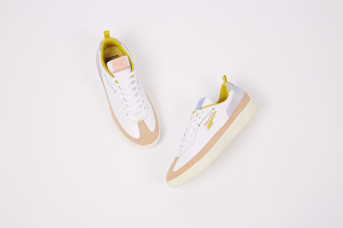 On retrouve deux paires de sneakers, une Style Rider et une Oslo-City. La première est proposée dans un look résolument rétro avec des imprimés multicolores sur l’ensemble de l’empeigne. On note la présence d’empiècements en daim sur l’avant et l’arrière du pied. Le logo KidSuper Studios est présent sur l’intérieur du pied quand la signature du collectif est visible sur le formstripe extérieur. La tige repose sur une imposante semelle, volontairement jaunie pour donner un look vintage au modèle.