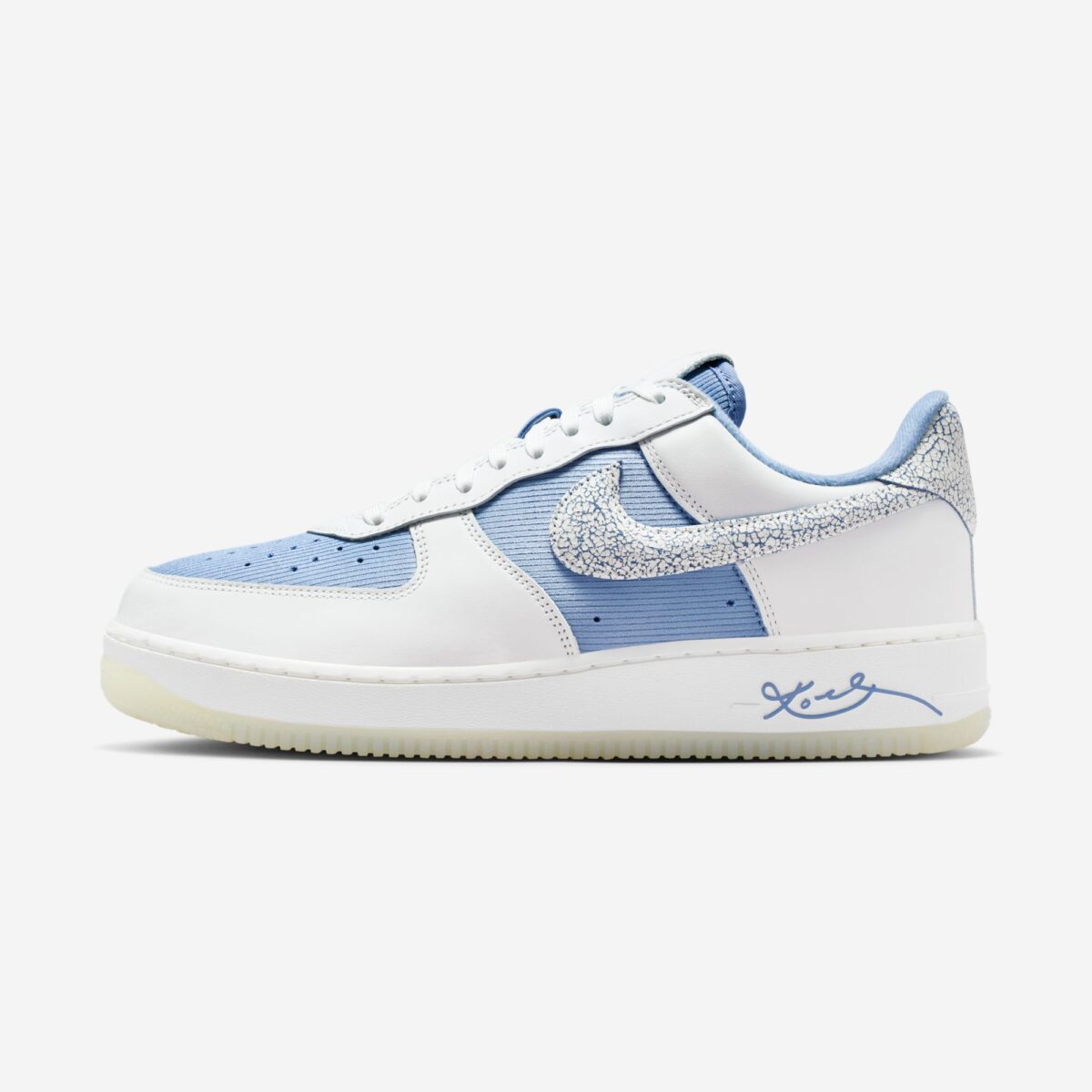 La palette de la Kobe Bryant x Nike Air Force 1 “City Of Champions” se distingue immédiatement par son choix chromatique évocateur : des teintes qui rappellent les couleurs et les textures du stade des Lakers jusqu’en 1999, The Forum. La base de la silhouette basse est en mesh côtelé bleu ciel, visible sur la toebox perforée et les panneaux latéraux. Ces derniers portent des Swoosh en cuir blanc et bleu, avec un effet craquelé. La paire est renforcée par des empiècements en cuir lisse blanc, sur les garde-boues et les passages de lacets. La languette porte des logos Kobe, de même que le heeltab. La sneaker repose sur une semelle intermédiaire immaculée, embossée de la signature de Kobe. Une semelle extérieure translucide et phosphorescente finalise ce design en hommage au début de carrière de Kobe Bryant.