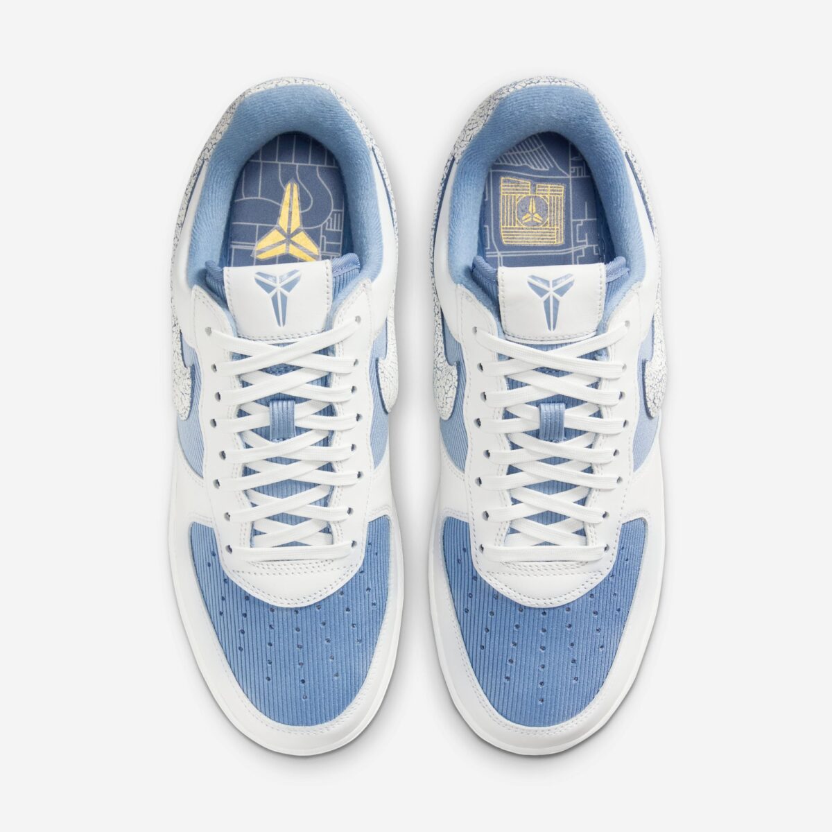 Ce qui distingue véritablement la Kobe Bryant x Nike Air Force 1 “City Of Champions”, ce sont les détails subtils mais significatifs qui ancrent la paire dans l’héritage de Kobe et de l’équipe qu’il a façonnée. L’intérieur de la languette affiche un visuel du Forum, avec les inscriptions 67-99, qui rappellent ses années de gloire. La semelle intérieure bleu ciel est imprimée d’un plan d’Inglewood, le quartier de Los Angeles où se situait The Forum. Elle est dotée de la technologie React et affiche des logos Kobe blanc cassé. La paire vient accompagnée de deux paires de lacets, une blanche et une bleue ciel, toutes deux agrémentées de deubrés dorés. Un hangtag en cuir blanc, gaufré d’un logo Black Mamba doré, est également fourni avec la sneaker.