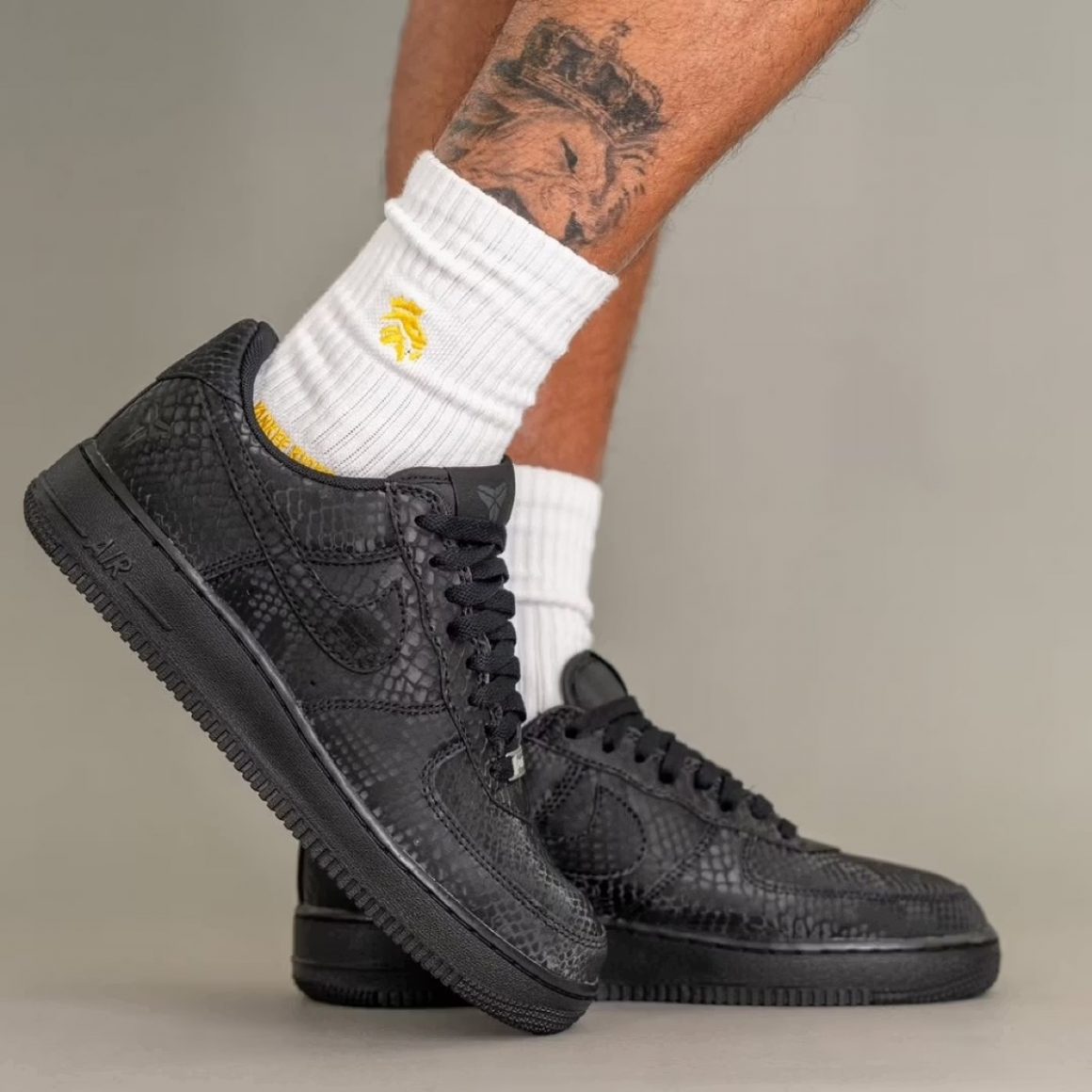 Ce coloris ne se contente pas de rendre hommage à Kobe Bryant : il évoque son mental de compétiteur, son goût pour le défi et sa capacité à dominer dans l’ombre. Le noir intégral symbolise autant la concentration que la force silencieuse de l’athlète, tandis que la texture serpent rappelle son surnom et sa philosophie de jeu : précis, rapide, létal. En plus de ces aspects esthétiques, cette Air Force 1 bénéficie du traitement Protro, avec notamment une semelle en ReactX pour un maximum de confort.