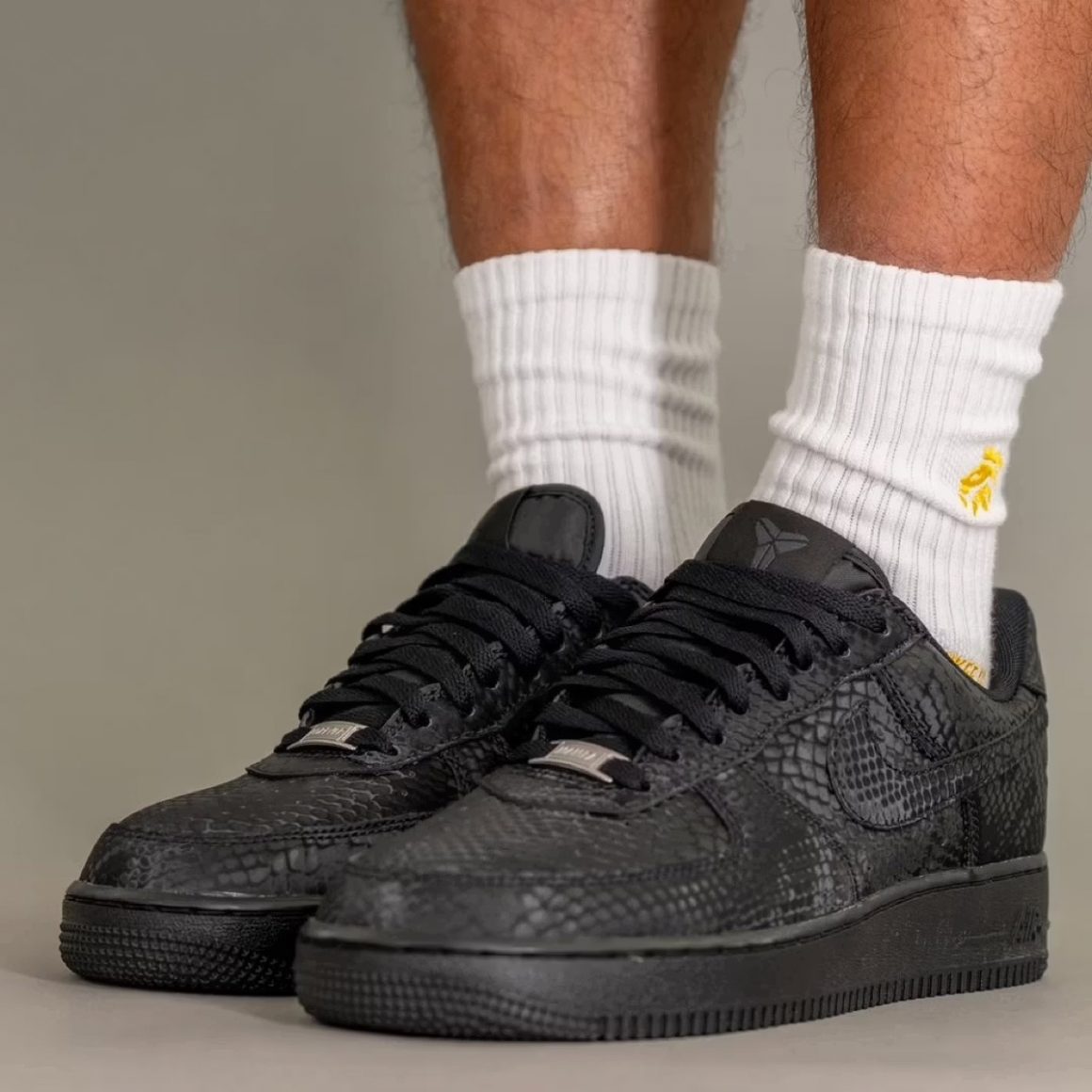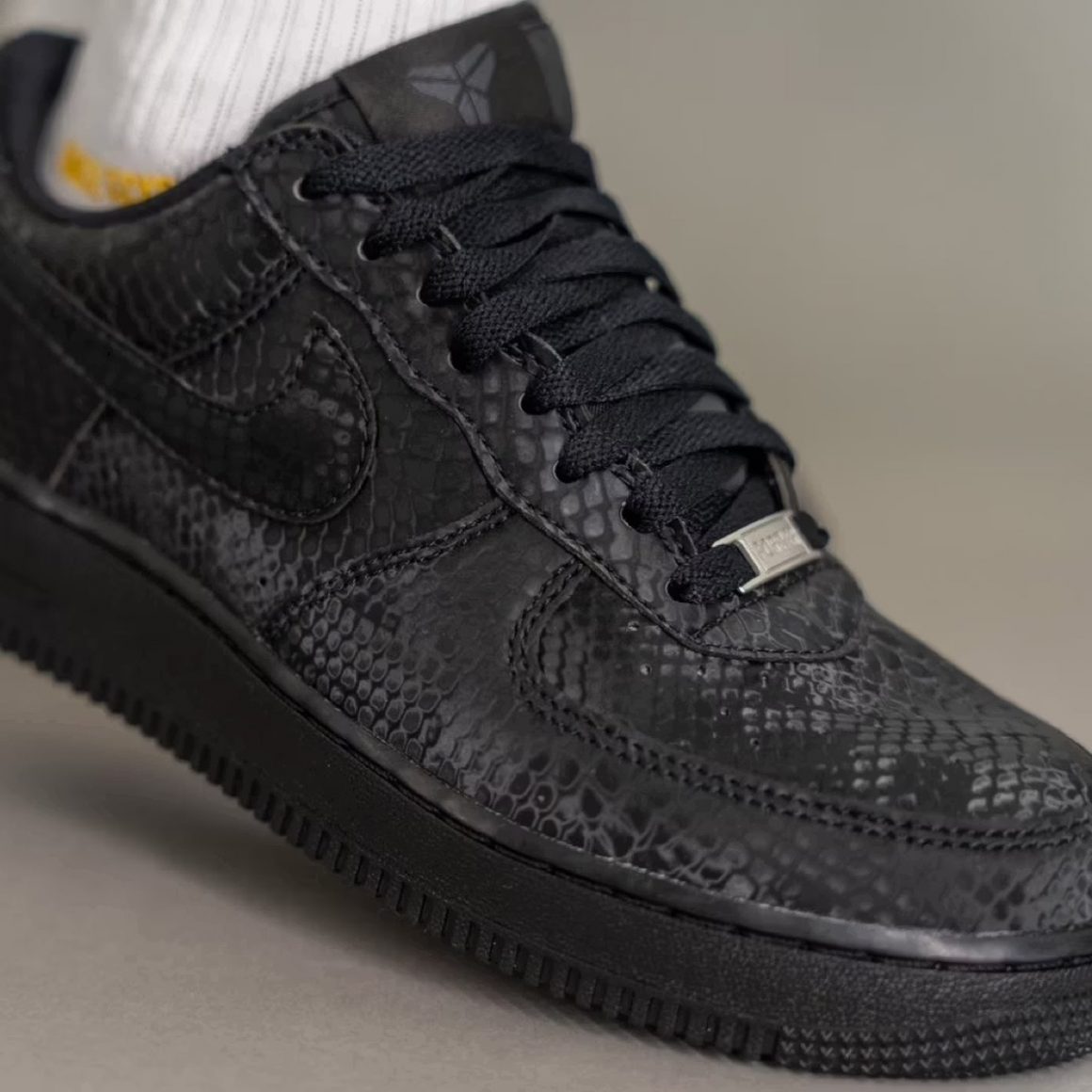 Prévue pour novembre 2025, la Kobe Bryant x Nike Air Force 1 “Triple Black” s’impose comme une version à la fois sobre et redoutablement élégante de la silhouette la plus iconique de Nike. Fidèle à l’héritage de Kobe Bryant, cette édition adopte un traitement monochrome noir intégral et une texture peau de serpent qui vient rappeler l’esprit de la “Black Mamba”.
