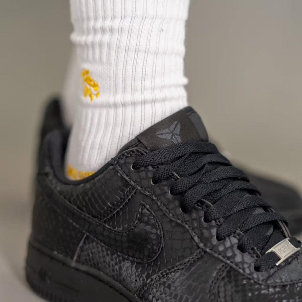La première chose qui frappe dans cette Kobe Bryant x Nike Air Force 1 “Triple Black” est son approche visuelle radicale : tout est noir, du cuir texturé façon serpent jusqu’à la semelle extérieure. Ce traitement uniforme met en avant les lignes épurées du modèle et lui confère un côté presque sculptural. L’effet peau de serpent recouvre l’ensemble de l’empeigne, apportant un grain subtil qui capte la lumière et souligne l’idée d’agilité et de danger associée au Mamba. Les lacets, la languette, le swoosh latéral et même les surpiqûres se fondent dans ce noir profond, créant une continuité visuelle parfaite. Seuls de petits détails ton sur ton, comme les broderies “8” et “24” au talon, ou le logo Kobe sur le quart arrière, viennent discrètement se distinguer pour rappeler le caractère commémoratif de cette édition.