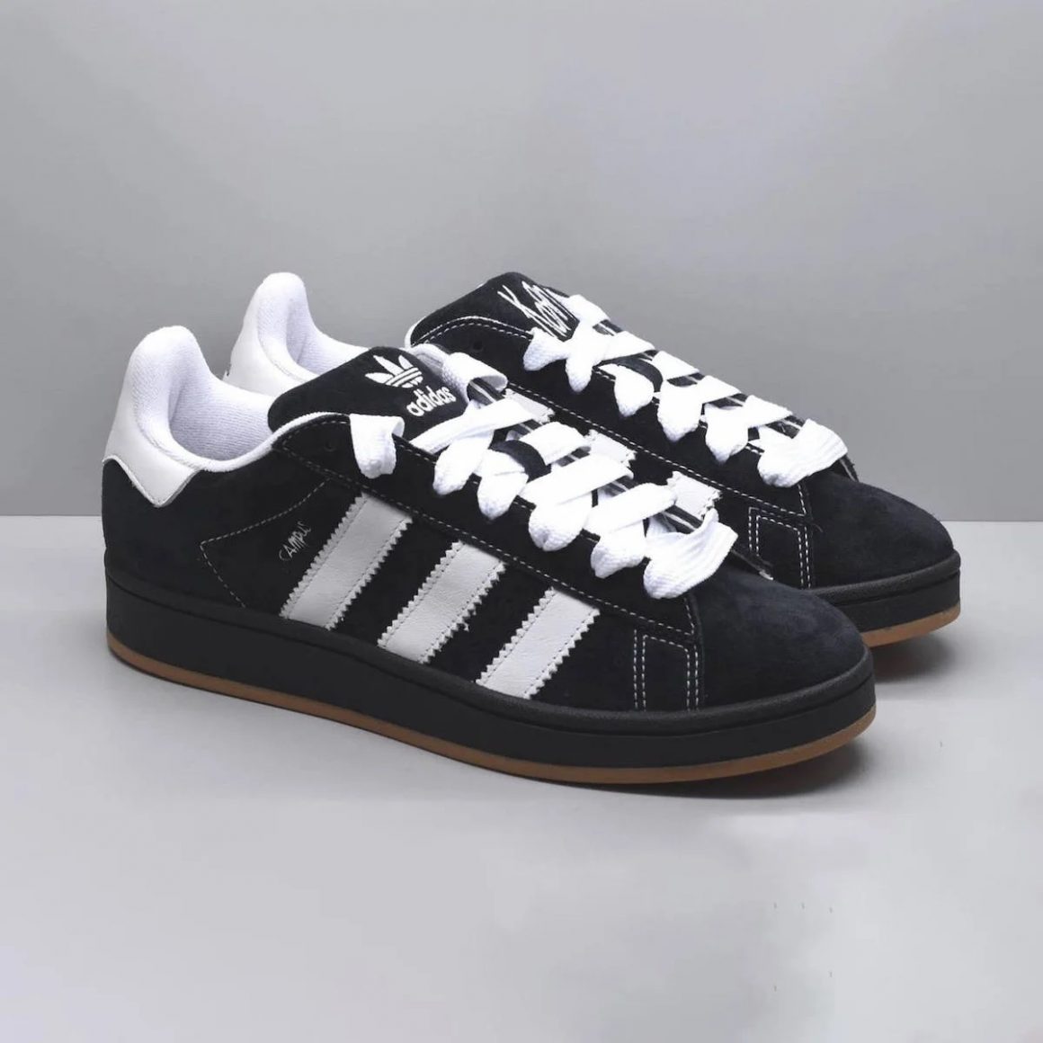 La première sneaker de cette future collaboration est la Korn x adidas Campus 00s. Son imposante silhouette revisite celle de la classique Campus d’adidas. Sa tige en cuir suédé s’habille de noir et laisse apparaître des coutures blanches, assorties aux trois bandes latérales en cuir. Des lacets plats épais blancs ajoutent du contraste à la sneaker et se marient aux broderies de la languette. Celle-ci porte un logo trèfle sur le pied droit et le logo du groupe sur le pied gauche. Le quart arrière est gaufré d’une inscription Campus argent, tandis que les heeltabs blancs sont gaufrés de logos trèfle et Korn noirs. La paire repose sur une semelle intermédiaire noire, et une semelle extérieure en gomme naturelle.