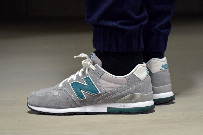 La paire est en daim et nylon gris clair. Le turquoise a été appliqué sur le N, les logos de la languette et du talon ainsi que la semelle extérieure.