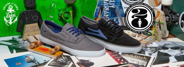 Lakai sort pour la fin de l’année deux skate-shoes en collaboration avec Girl pour célébrer les vingt ans d’existence de la marque de boards. Les skate-shoes choisies pour cette collection sont la Lakai Camby et Lakai Griffin. Ces deux modèles Lakai x Girl sont visibles en détails dans la suite.