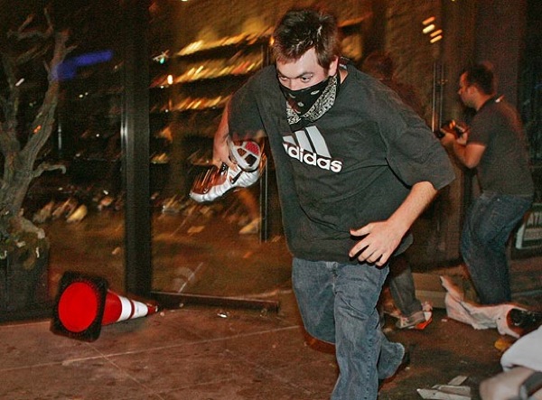 Après la victoire des Lakers face Orlando synonyme de titre pour les partenaires de Kobe, des émeutes ont éclaté à Los Angeles avec pas mal de dégâts dont ce shop de sneakers, The Holy Grail, complètement dévalisé…