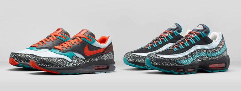 Ici ce sont trois paires de Nike Air Max dont l’inspiration est puisée chez le Kabutomushi : la Nike Air Max Lunar 1, Nike Air Max Lunar 90 et la Nike Air Max 95. Le safari en version métallique est censé représenter l’insecte (on a cherché mais on a trouvé aucune photo du scarabée rhinocéros qui y ressemblerait, vous pouvez nous contacter si vous trouvez quelque chose). Le mix de plusieurs couleurs représente le caractère iridescent de la carapace de l’animal.