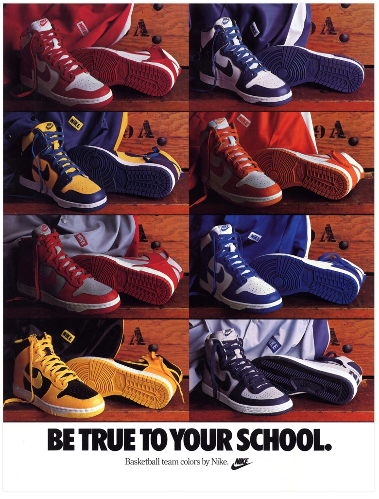 C’est en 1985 que la Nike Dunk née avec un design réalisé par Peter Moore, le créateur de la Air Jordan I, qui s’inspire d’une paire déjà dédiée au basketball, la Nike Air Force 1.