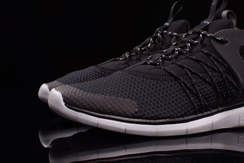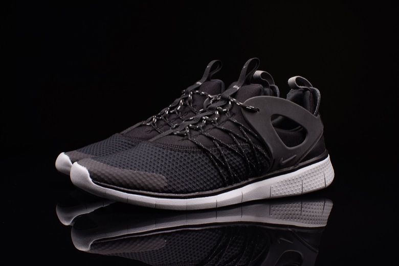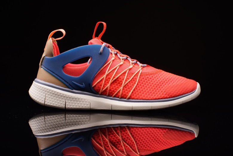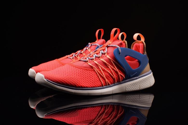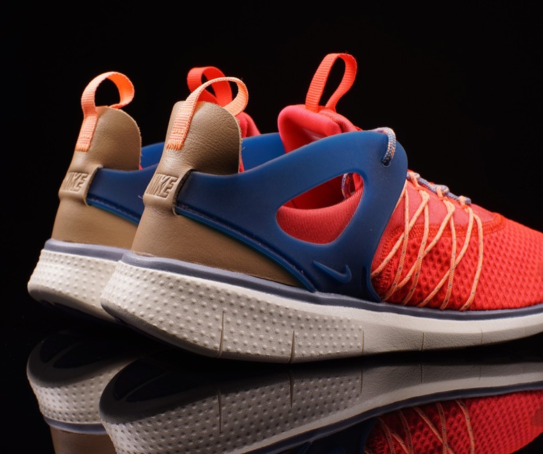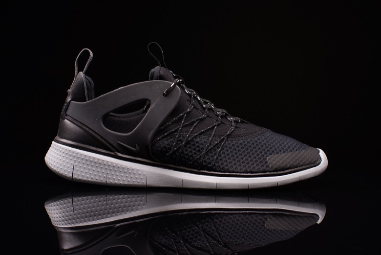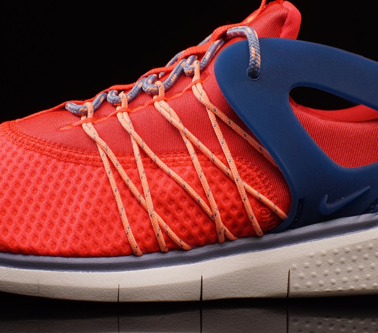 On voit tout de suite quelques ressemblances avec des modèles déjà bien établis notamment la Nike Air Huarache ou encore la Nike Air Presto ou sa version Cage. La paire semble très légère avec son upper synthétique et son renfort au talon doit permettre un meilleur maintien du pied. Le Nike Flywire a été appliqué au niveau des passants de lacets. Enfin c’est sur une semelle Free qu’est montée le chausson.