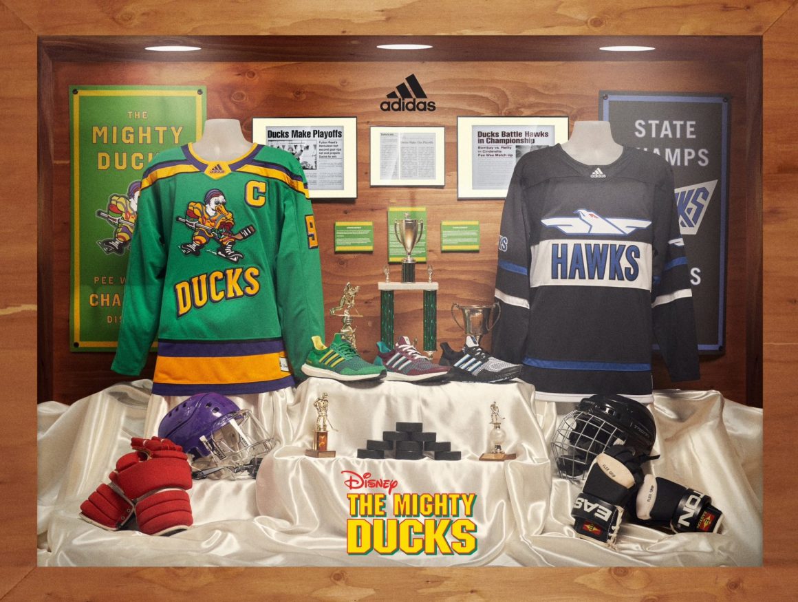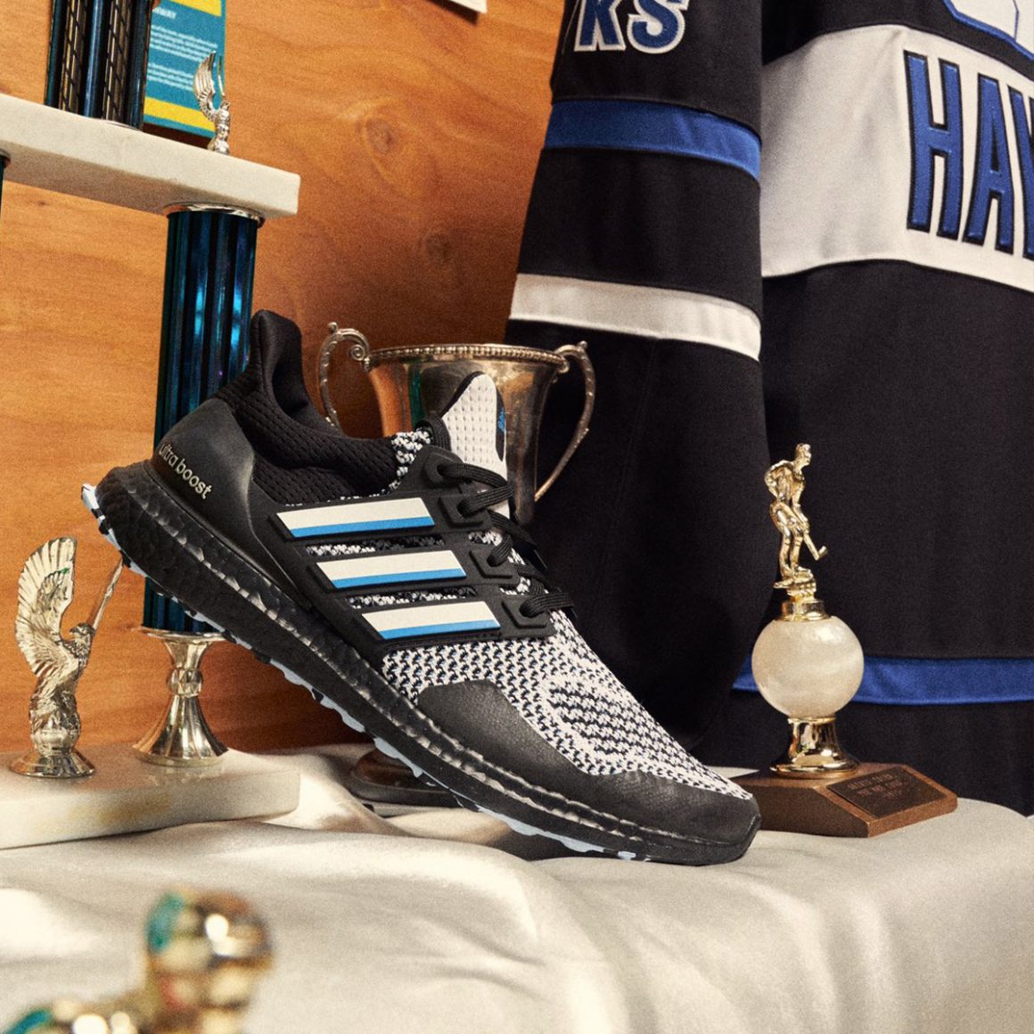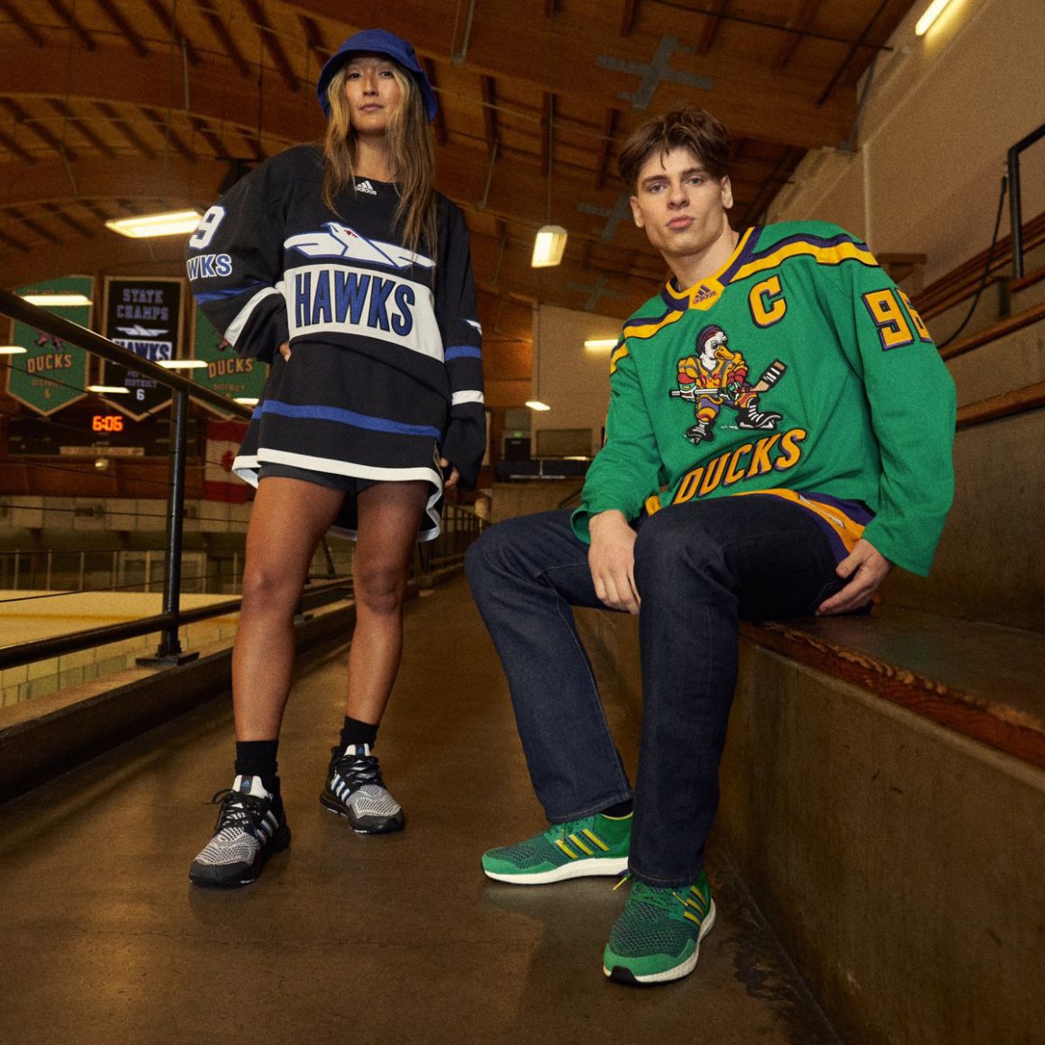 adidas propose une seconde paire, en hommage au personnage de Jesse Hall. Sa construction chromatique rappelle celle des “vrais” Mighty Ducks d’Anaheim, équipe officielle de la NHL. La tige en Primeknit bordeaux est relevée de touches vert d’eau et blanc. Les trois bandes latérales blanches s’accordent aux lacets et à la semelle intermédiaire. Le vert d’eau est également utilisé sur le sockliner et le renfort au talon. Enfin, la dernière paire du pack représente l’équipe des Hawks avec son tissage noir et blanc et ses touches de bleu.