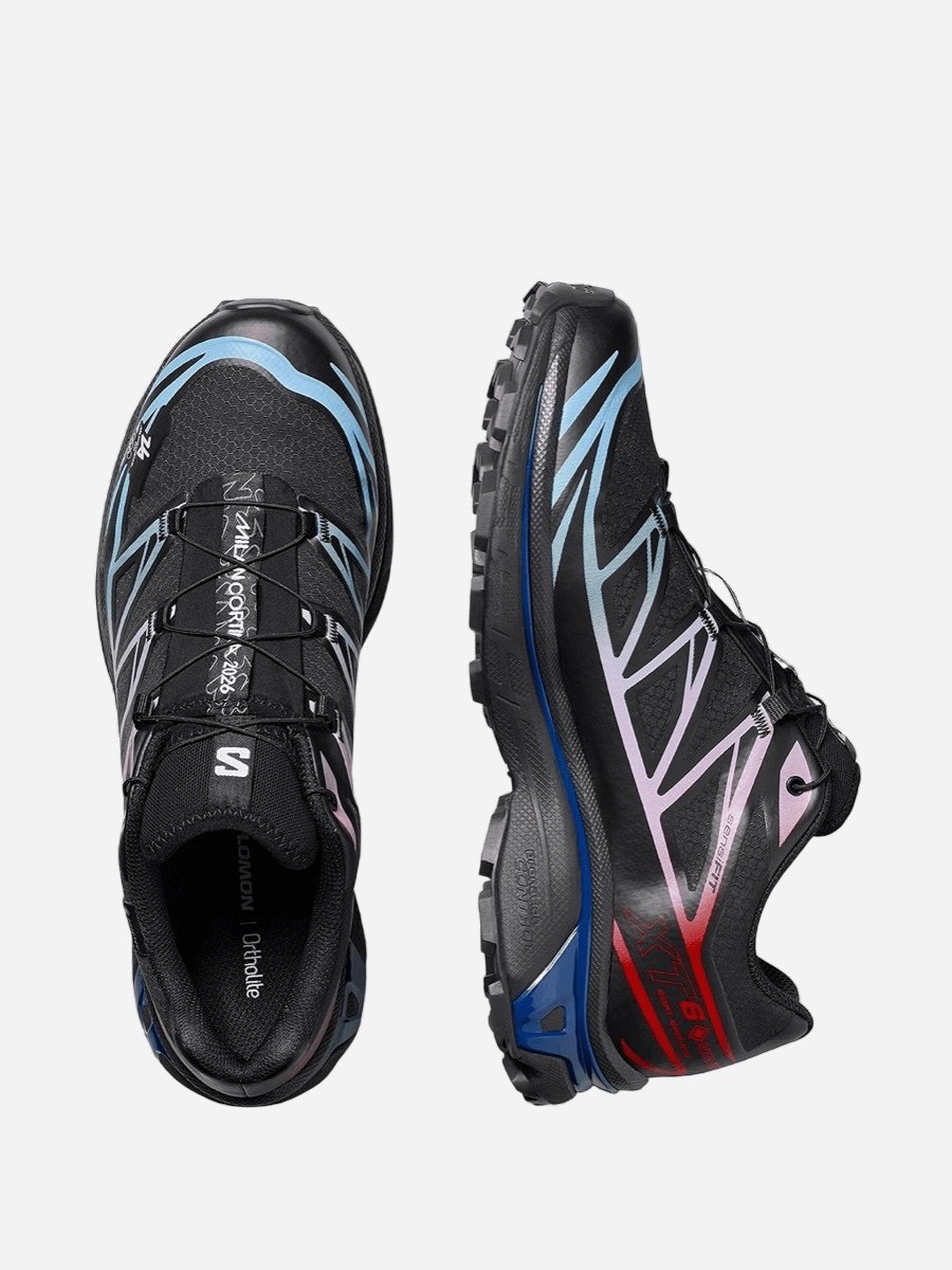 À l’origine, la Salomon XT-6 est conçue pour affronter des terrains exigeants et des conditions extrêmes. Cette version Milan Cortina 2026 conserve pleinement cet ADN technique. La tige associe une structure en mesh robuste à des renforts en film TPU, garantissant à la fois respirabilité, résistance et maintien. L’intégration d’une membrane Gore-Tex assure une protection imperméable tout en permettant au pied de rester au sec et ventilé, un équilibre essentiel pour une chaussure pensée pour affronter pluie, neige ou boue. Sous le pied, la semelle intermédiaire en EVA absorbe efficacement les chocs, tandis que le châssis ACS stabilise la foulée en accompagnant les mouvements naturels. L’ensemble repose sur une semelle extérieure Contagrip, réputée pour son adhérence sur surfaces variées, qu’il s’agisse de sentiers rocailleux, de terrains humides ou d’environnements urbains. Le système de laçage rapide Quicklace complète cette architecture technique, offrant un ajustement précis en un seul geste.