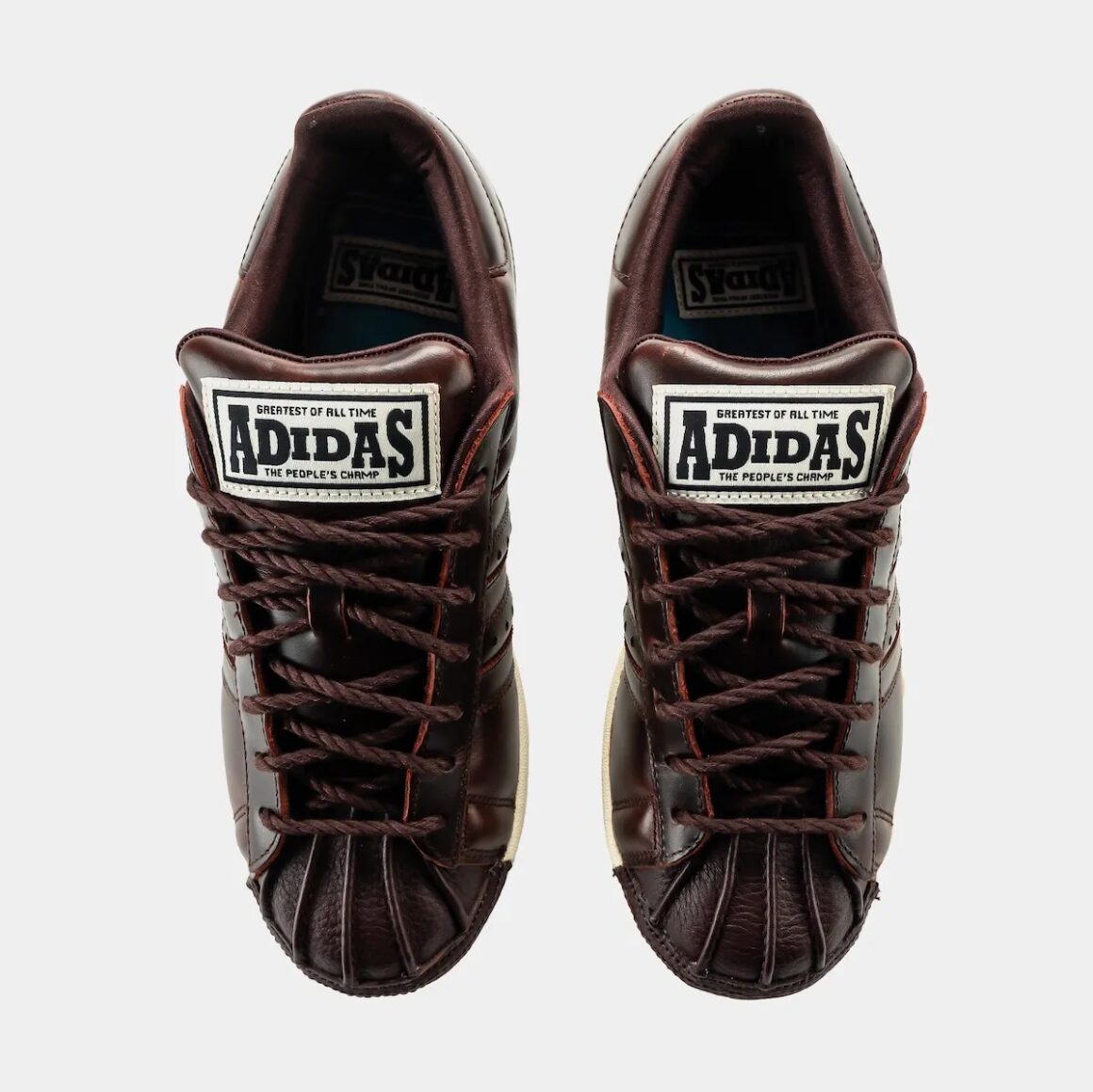 Au-delà de la palette, ce qui distingue véritablement ces Superstar, ce sont les détails narratifs disséminés avec subtilité. Le quart arrière des paires est marqué d’une citation du GOAT, soulignant sa supériorité sur le ring. Elle surmonte une inscription “Greatest Of All Time”, matérialisée ici par des perforations en étoile. Le côté intérieur des paires rend hommage à deux des matchs les plus marquants de la carrière de Muhammad Ali. Le pied droit est marqué du logo “Rumble in the Jungle”, où il a dominé George Foreman au Zaïre, tandis que le pied gauche fait référence à son match contre Joe Frazier, le mythique “Thrilla in Manila”. Enfin, on peut noter le clin d’œil à la marque d’équipement de boxe Everlast, dont le logo est détourné sur la languette des paires.