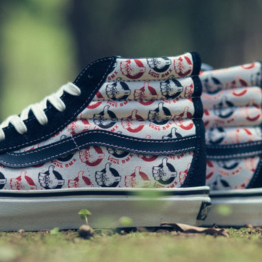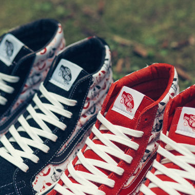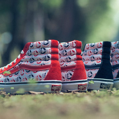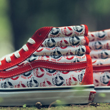 C’est dans l’univers du BMX que l’inspiration est puisée avec deux modèles déclinés en deux versions, les Vans Sk8-Hi et Vans Authentic. Le premier est proposé soit en blanc/rouge soit en noir/blanc. On retrouve sur l’empeigne une illustration, un pouce levé, qui est dupliquée façon monogramme. Du daim a été appliqué sur les talons pour rappeler les jazz stripes.