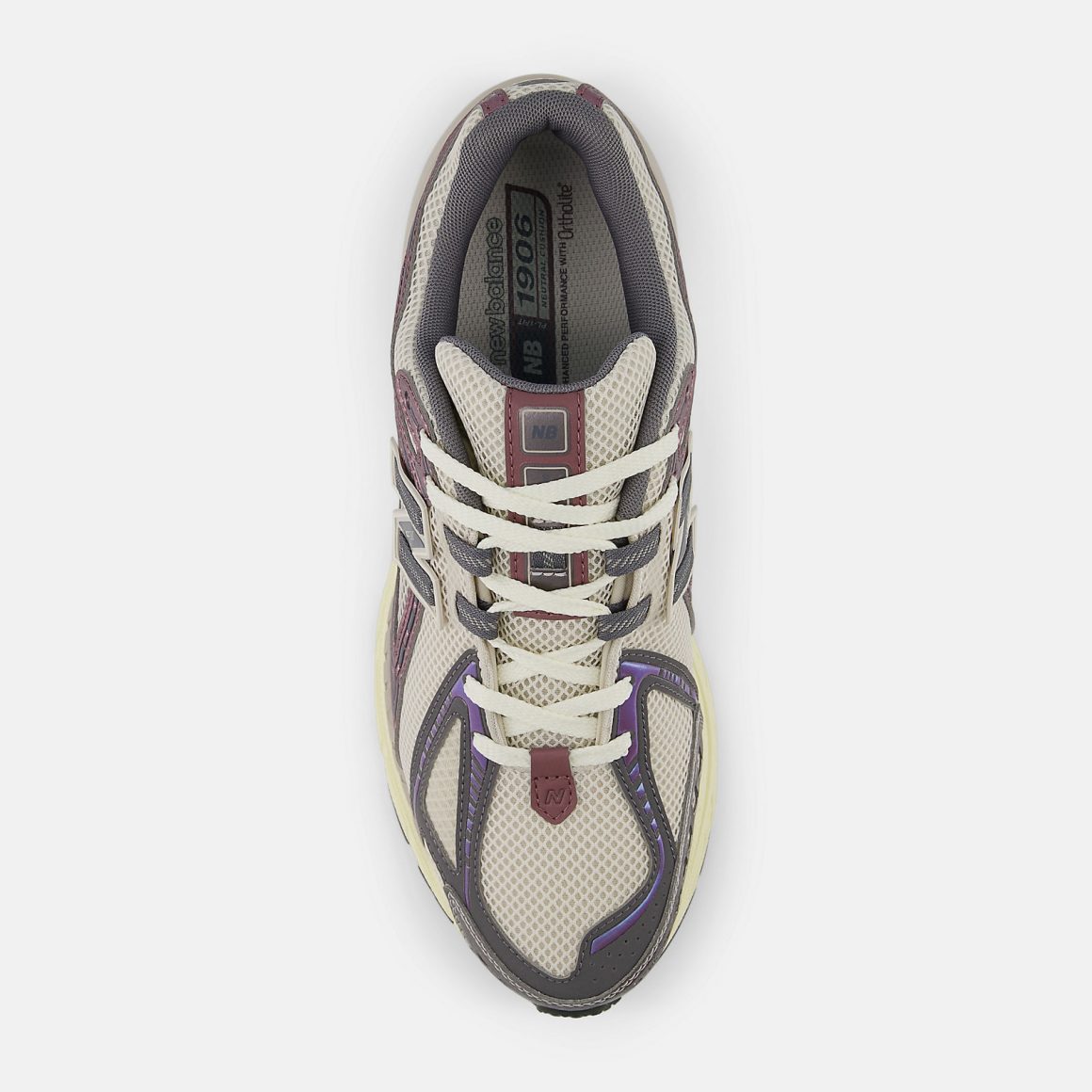 La dernière déclinaison du pack est la New Balance 1906 R Licorice Moonbeam. Sa base crème est relevée de cuir métallisé mauve et anthracite. Les renforts de toebox anthracite portent des motifs violets. Le renfort en cuir gris à l’avant rappelle les logos latéraux, abritant un système de laçage rapide.