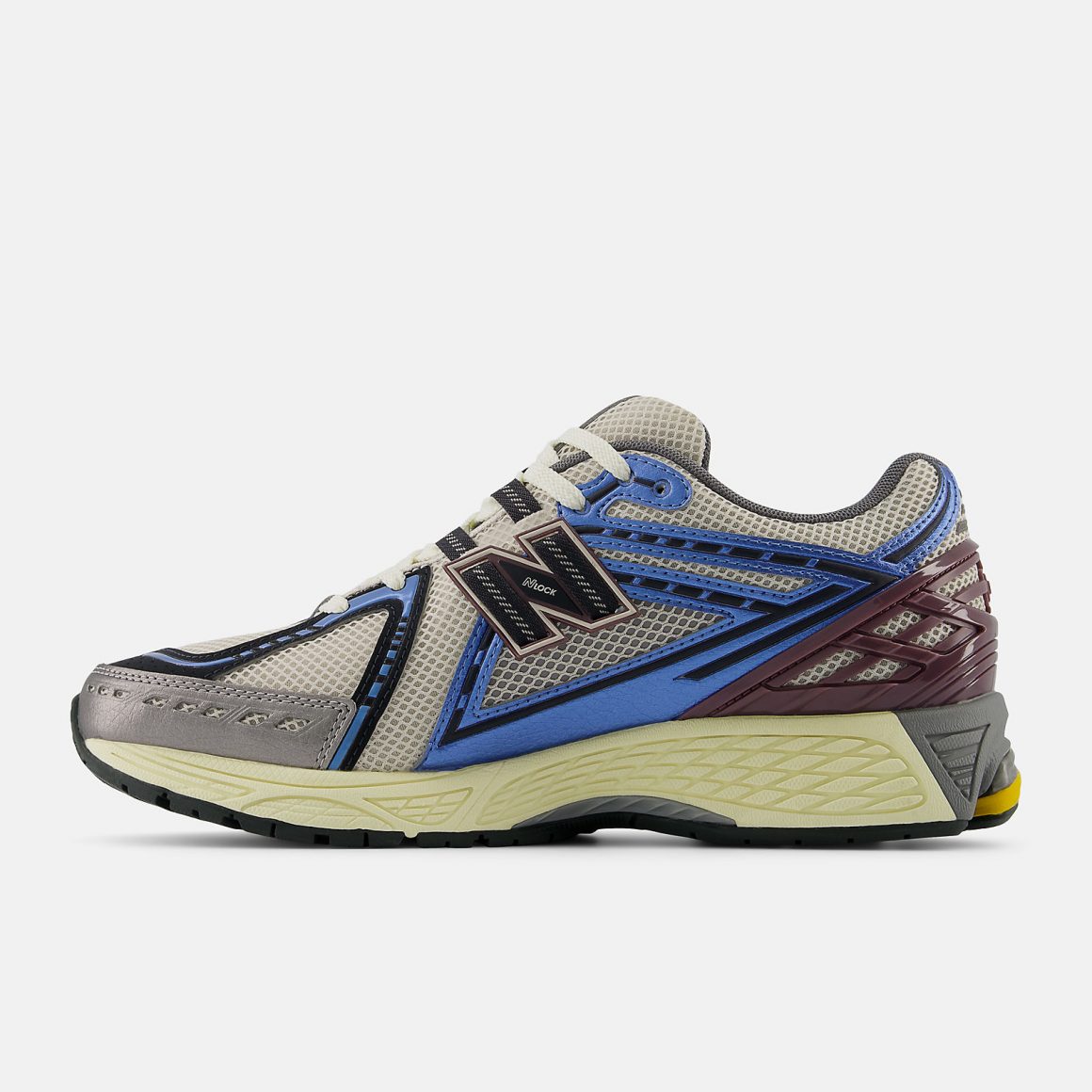 L’itération New Balance 1906 R Blue Moonbeam se distingue par des panneaux latéraux renforcés de cuir bleu, ainsi que par un renfort en TPU bordeaux sur le talon. On retrouve également ce ton sur le liseré du quart avant de la semelle intermédiaire, qui reprend les mêmes coloris que les autres déclinaisons du pack.