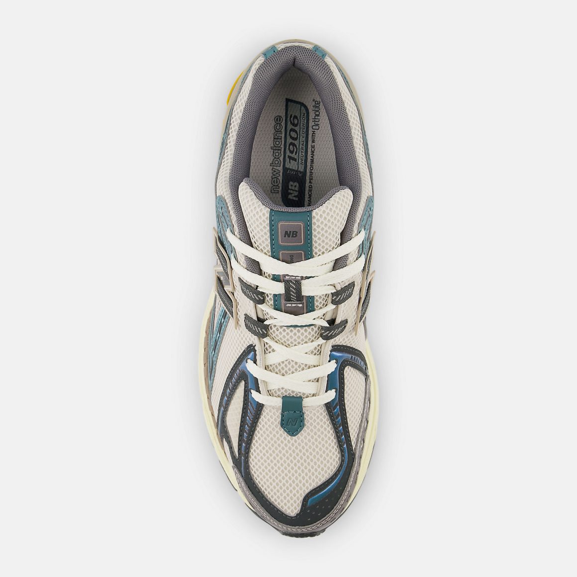 Sur la New Balance 1906 R New Spruce Moonbeam, la tige en mesh crème est relevée de détails en cuir bleu turquoise métallisé. Ils apparaissent sur les panneaux latéraux, accompagnés d’anthracite pour rappeler le N latéral. Les renforts de la toebox sont en cuir noir, traversés de motifs bleus, assortis au N embossé sur l’avant de la semelle extérieure noire.